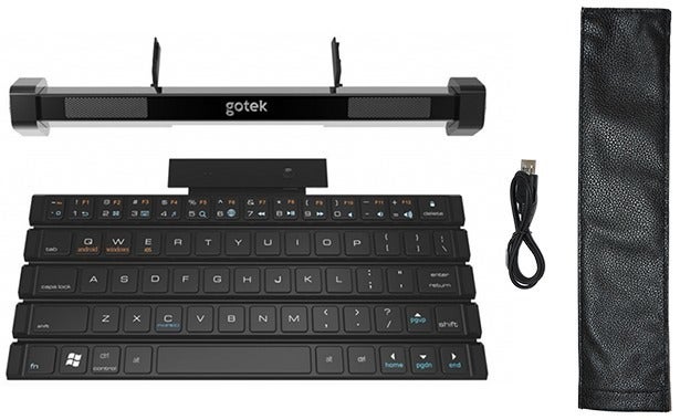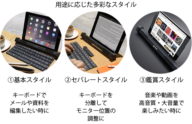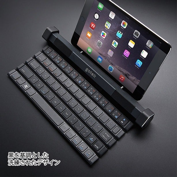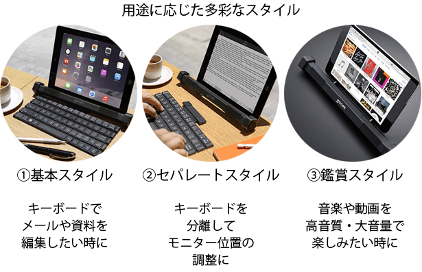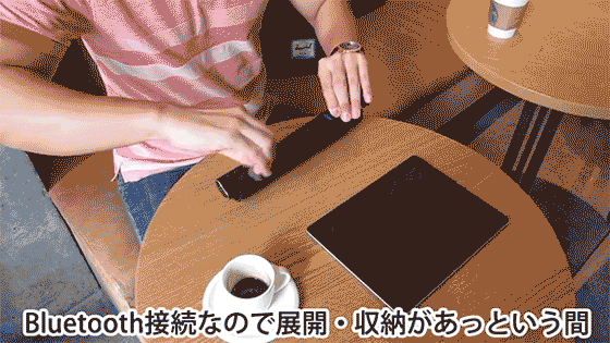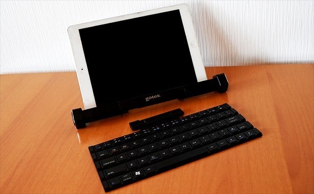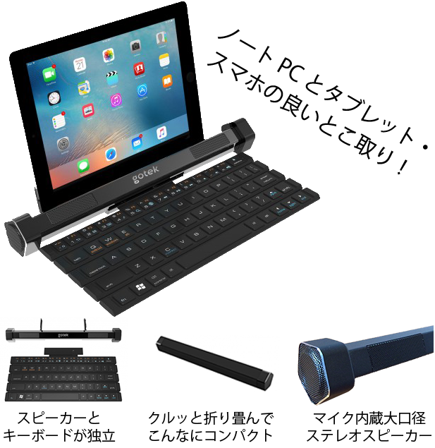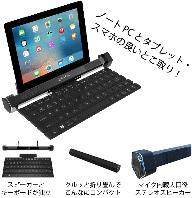 Bluetoothによる簡単接続でGotype本体の固定スタンドに10インチまでのタブレットとスマホを立て掛けてノートPCのように使用できます。