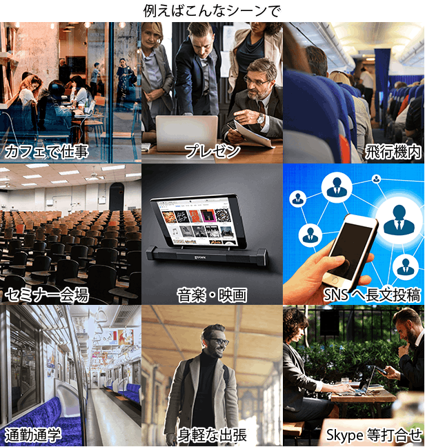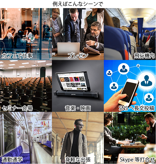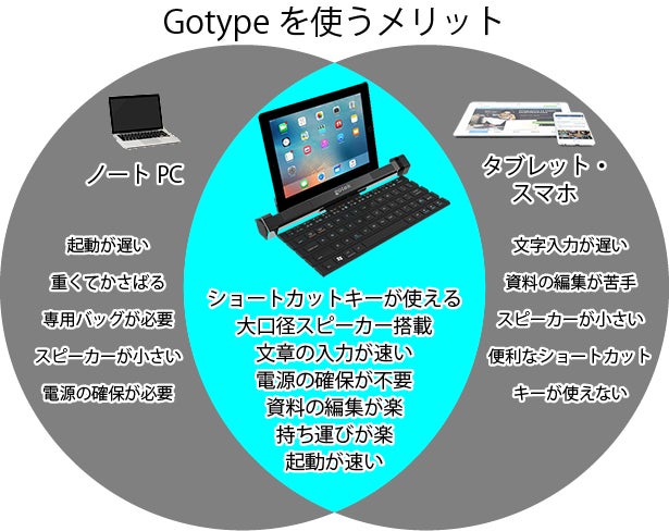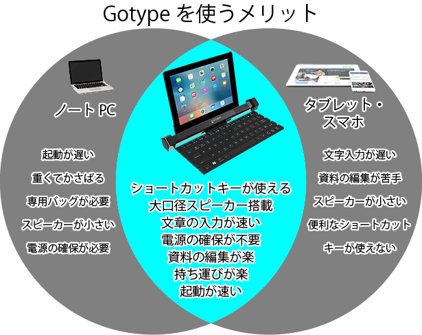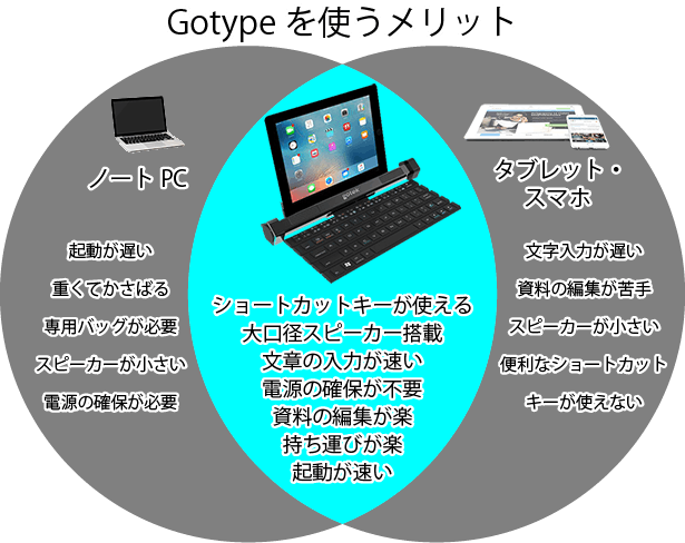持ち運びに便利なGotypeはタブレットやスマホをノートPCのように使用できるので、様々なシーンで活躍します。