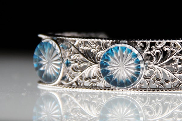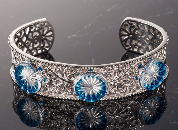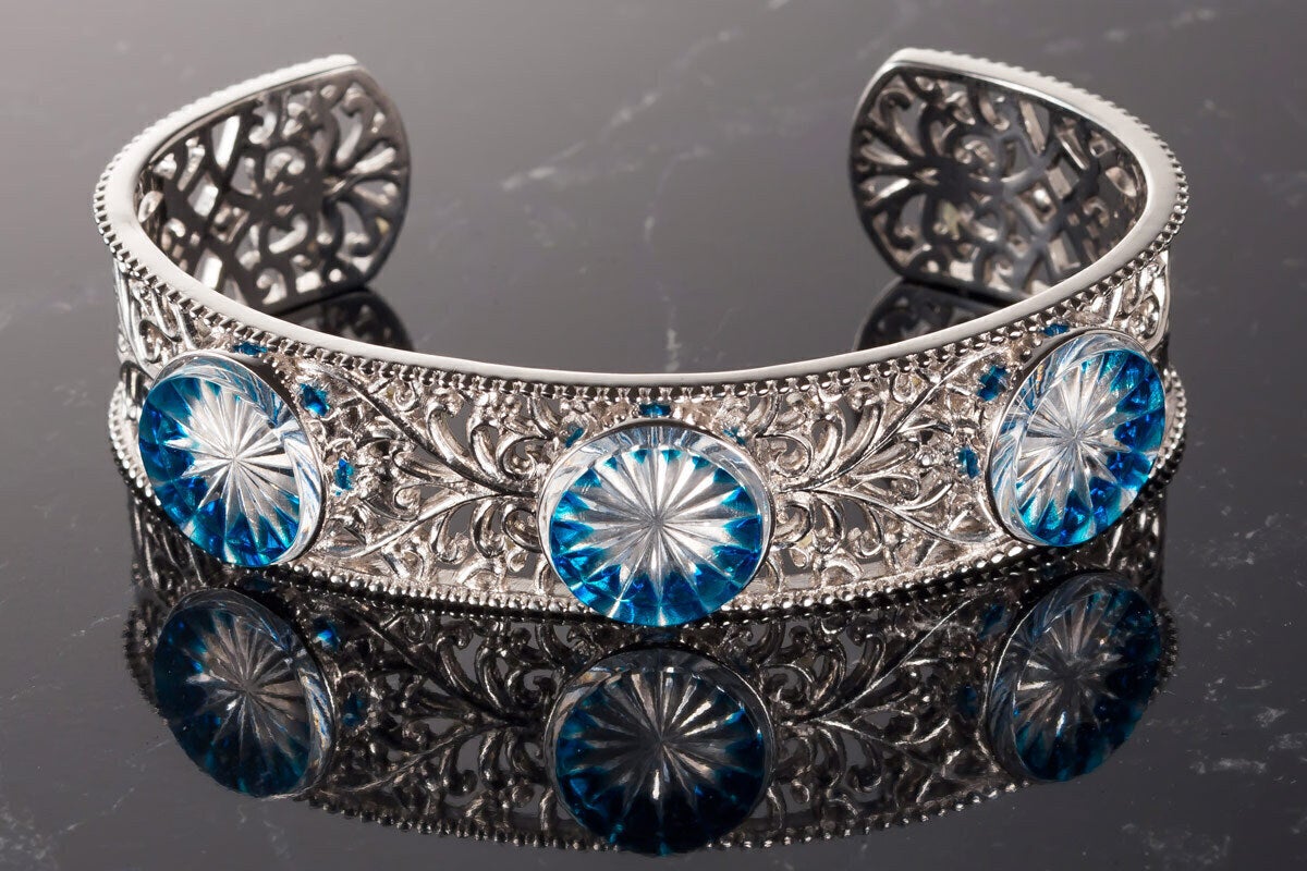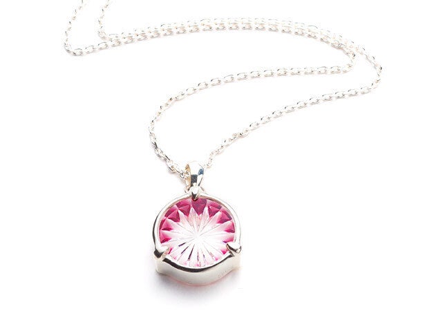 江戸切子は日本のカットグラスの一つで、江戸末期に西洋より渡来したカットグラスが独自の進化をとげた日本の伝統工芸の一つです。細かいカットが特徴的で光にかざすと美しい光のプリズムや残像が人気です。コレをJewel、アクセサリーの世界に取り込みたいという思いは当然かもしれません。