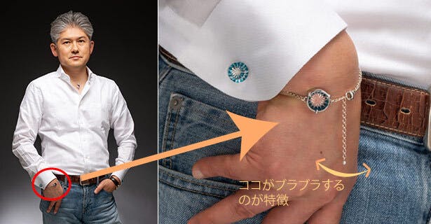 返礼品、リターンのJewel Kirikoチェーンブレスはシャツの袖に見え隠れしてチャーンの余りがブラブラしてチョイお洒落です!男性にも女性にも人気のリターンです♪