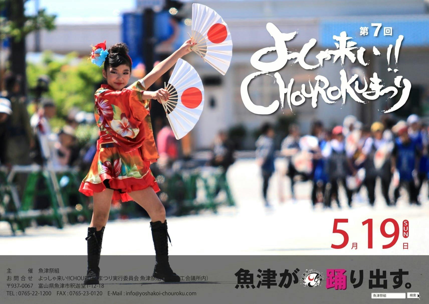 よっしゃ来い!!CHOUROKUまつりは、「魚津が踊り出す!」をキャッチフレーズによっしゃ来い!!踊りを踊り舞い、魚津市の賑わい創出と地域住民に元気や活力を持ってもらえることを想い、毎年開催しております。