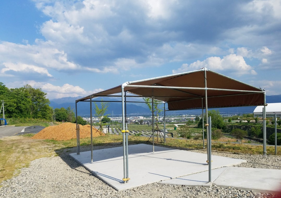 農園の直ぐ側には、スタッフの方々の休憩とバーベキューのために日除けタープを立てました。単管を加工して手作りです。頭の中の計算上では台風にも耐えるはずですが、自信はありません!飛んだら飛んだで、また改良してチャレンジします!