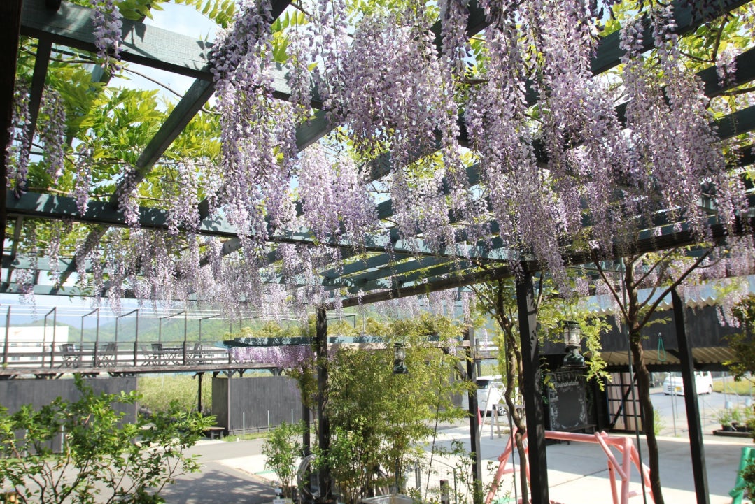 観光農園では藤の花が満開に咲き誇っています。7年前、友人から30センチの藤の苗木をもらったのがきっかけで、農園直売所のテラスに棚を作り定植して4年、今年は見事に咲きました!