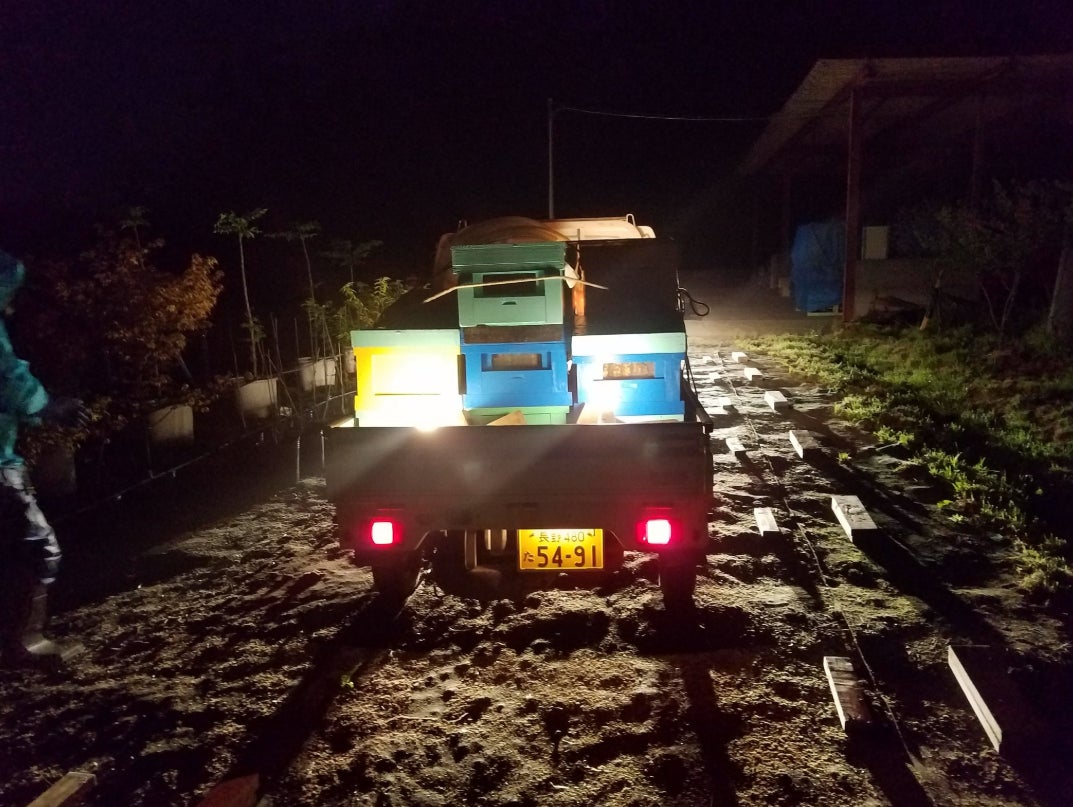 闇夜の泥棒ではありません、ミツバチの移動です。観光農園のオープン準備、ご来園されたかたがたが刺されてはいけないので、ミツバチを須坂の観光農園から、山の畑に移しました。夜中の不気味なドライブ、誰もいない暗闇の中で少々恐怖を感じる作業です。