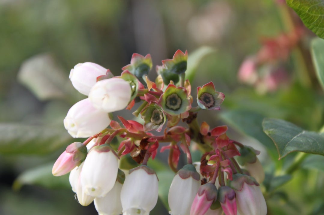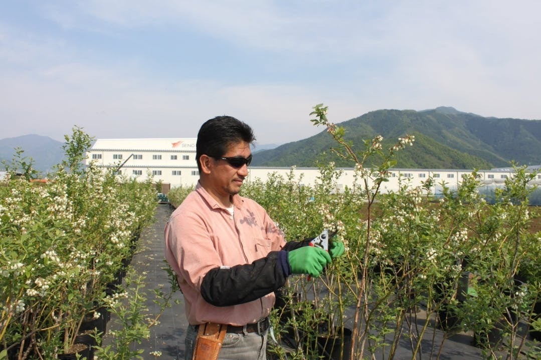 冬場の剪定作業で調整できなかった花の量を調整します。この作業を摘花(てっか)といい、 あえて咲き始めた花を摘み取ります。 花の数を限定することで残した果実に栄養分を集中させて夏には大粒のブルーベリー果実へと育ちます。