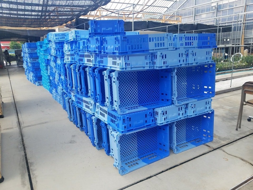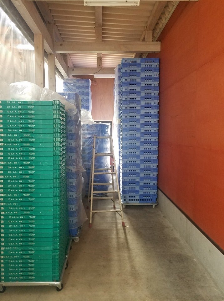 さて、実は森の畑では生果実だけでなく、冷凍ブルーベリー果実もあつかっています。今週は冷凍庫にブルーベリーをまとめていれるためのコンテナを洗いました。今シーズンの冷凍ブルーベリーの予定量は7トン、軽トラで35回往復して運びます↓
