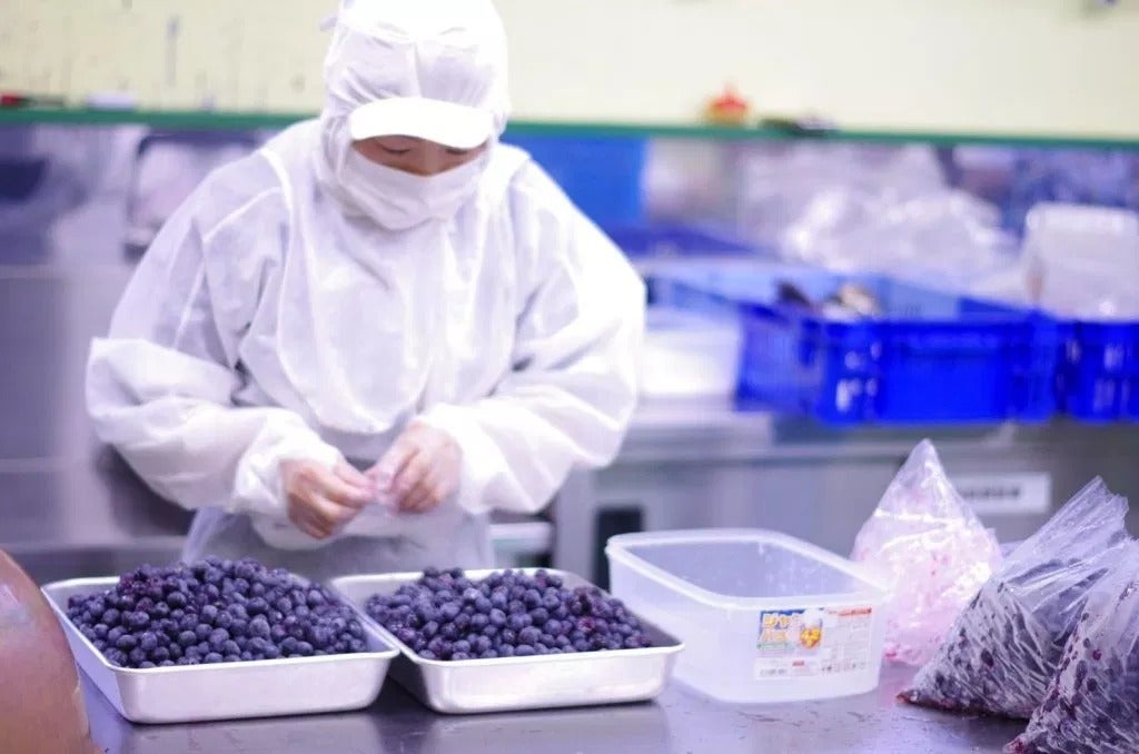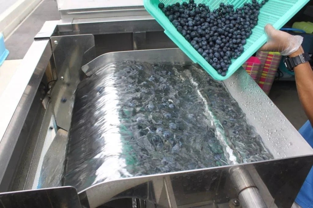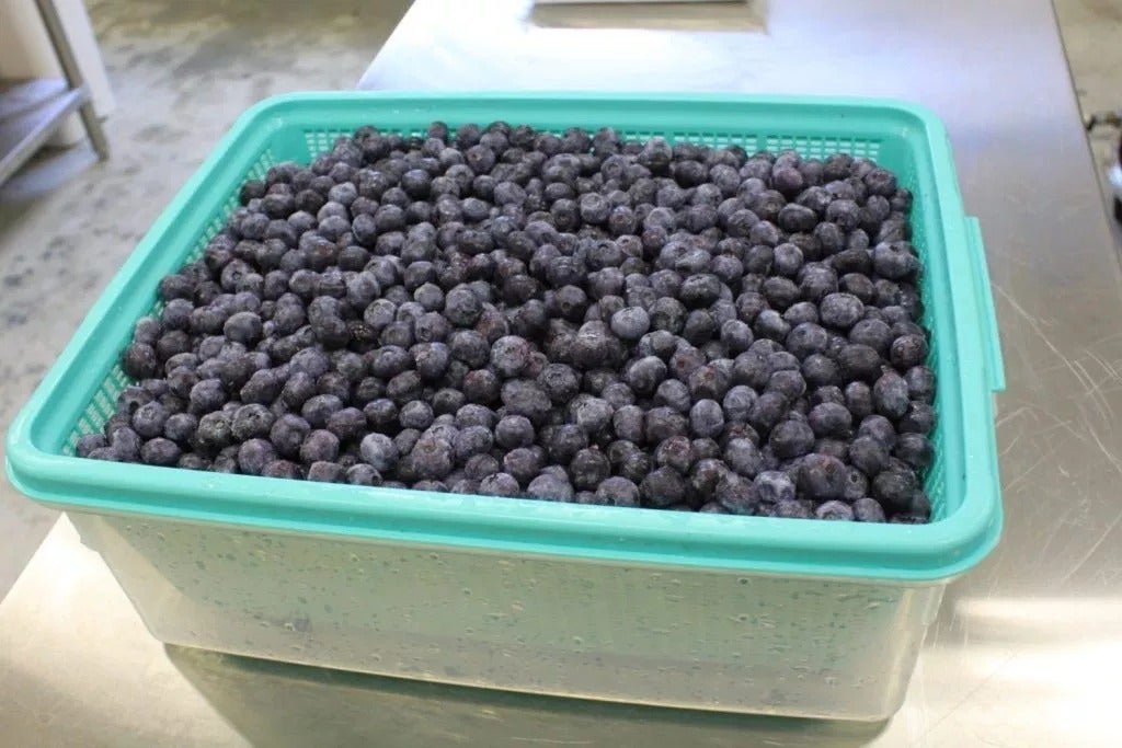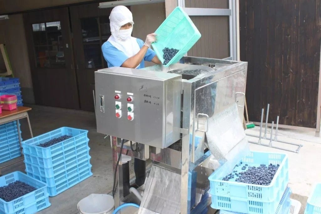まず、果実の洗浄から冷凍保管までを丁寧におこなっていきます。専用の洗浄機をもちいて、小さなゴミまで除去し、ブルーベリーを丁寧にあらいます。花とへたを丁寧に取り除き、 殺菌用のオゾン装置を経たオゾン水で洗浄します。