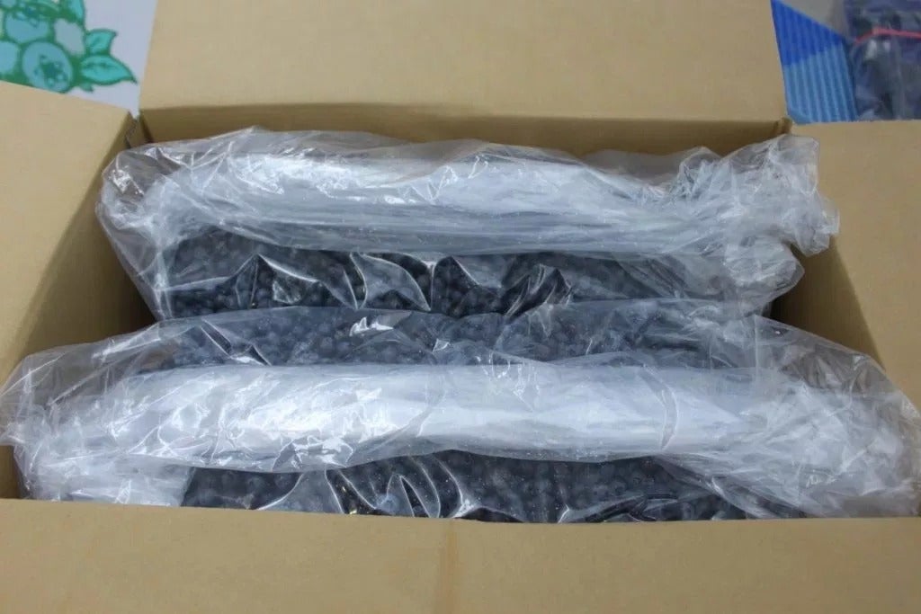 洗い終わったブルーベリーの果実を一度冷凍させます。冷凍させることにより果実内部の細胞膜が破壊され、味が凝縮されます。採れたての生のブルーベリーにはペクチンと呼ばれる物質が存在します。これを一旦冷凍することにより味を均一化し、安定した品質を保つことが出来ます。