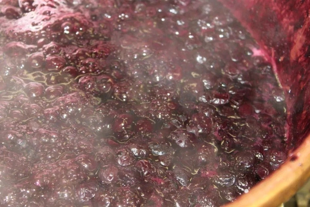 イオン効果のある銅鍋を用いてゆっくりと手作業で焦がさないようにしながら、15~20分ほど煮込んでいきます。銅イオン効果はジャムを綺麗な赤紫色にし、食物繊維の維持されたおいしい食感を再現してくれます。果実がつぶれないようにヘラで丁寧に混ぜていきます。