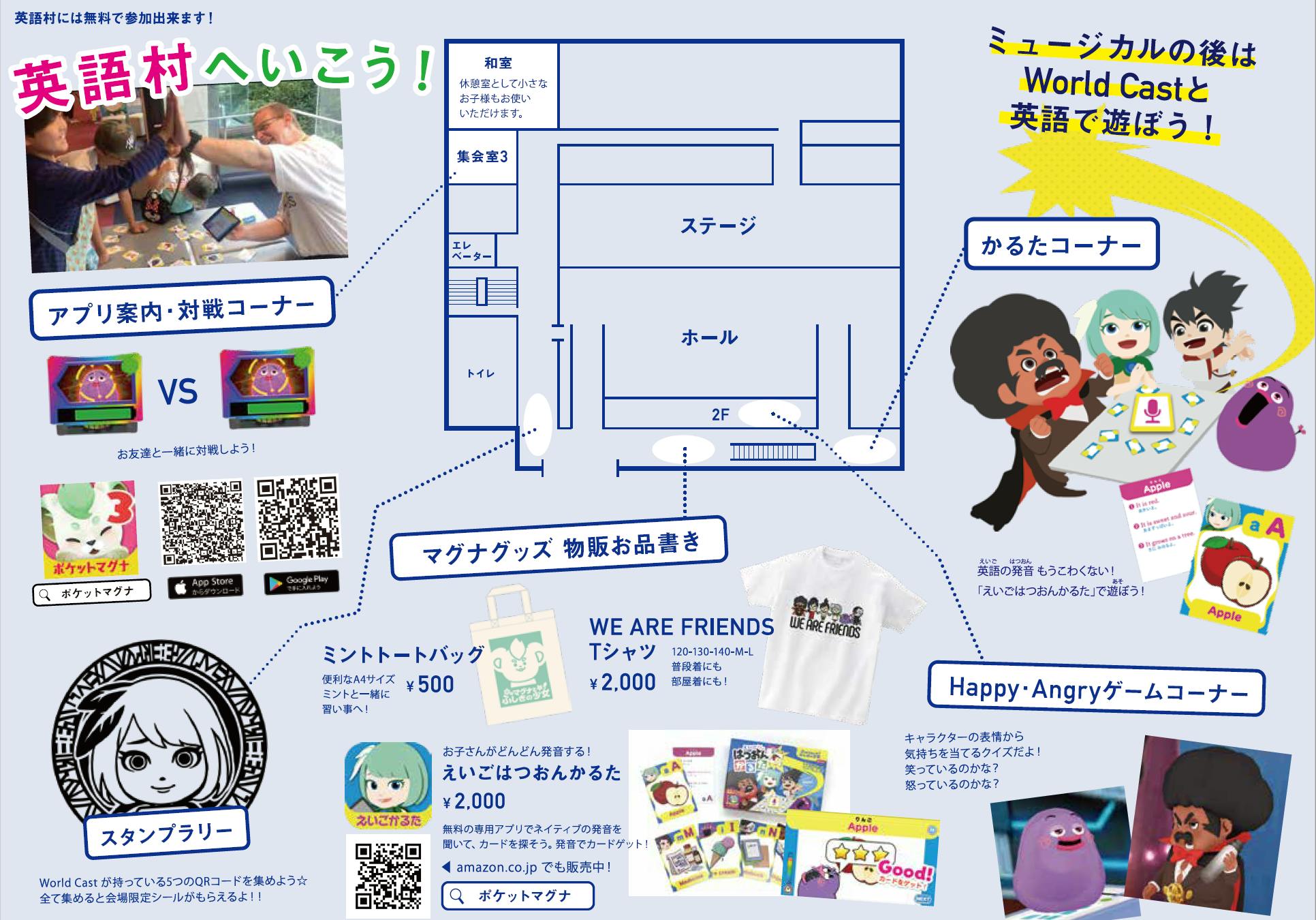 これはロビーから少し離れた同じフロアの会議室で開催しています。お友達や家族と一緒に原作ゲームの「マグナとふしぎの少女」を使って、対戦バトルができます。ミントをはじめ、レジェンズが必殺技で攻撃するには発音が必要! 失敗を恐れずにドンドン挑戦してみてください。発音が分からなくて、困ったら近くにいるWorld Cast に質問してみてね。