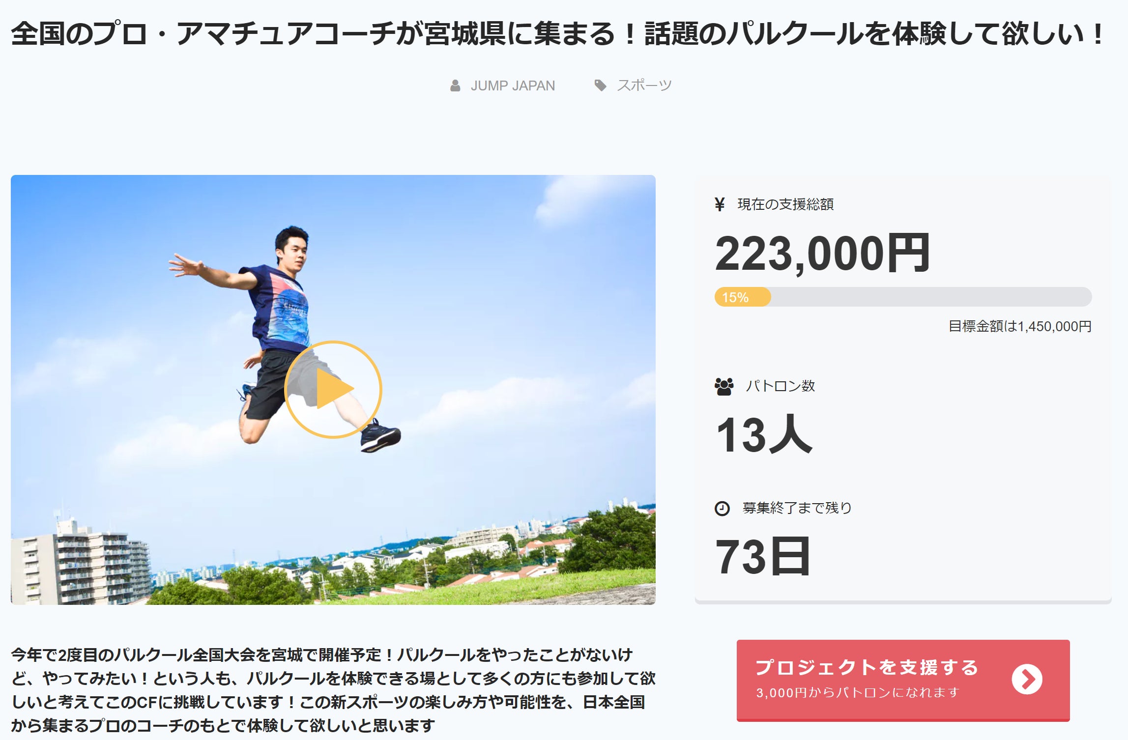 女性のパルクールのプロアスリート&コーチ「山本華歩」おはようございます。プロジェクト終了までの期間が50日となり、徐々に焦ってきましたよー!www前回のコーチ紹介では滋賀県の「北川敦丈」を紹介させて頂きました。次なるコーチはこの人!山本 華歩(やまもと はなほ)在住県名:埼玉県資格:A.D.A.P.T Level 1実績:アジアパルクール大会「Asian Parkour Championships2018」フリースタイル中級 優勝、フリースタイル女性部門 優勝意気込み:女性でも、運動が苦手でも、パルクールが楽しめることを知って多くの人に知ってもらえるよう頑張ります。今回のワークショップでは、Box1つで出来るパルクールの「ヴォルトフロー」を小学生以上のどなたでも、Boxを手をついて跳び超えるヴォルト、これを繋げて動くフローの簡単なやり方から様々なバリエーションまでチャレンジしてみましょう!周りにパルクールできる環境が無いからとパルクールに手を出せてないでいる方、Box1つで何時間でも練習できる秘訣を伝授します。沢山の方の支援をお待ちしておりますー!!