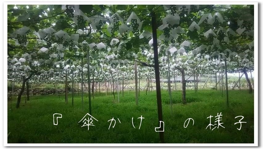私たちは、百農民ワインに使う葡萄を、生食用葡萄と同じように、ひと房、ひと房、手で『傘かけ』を施しています。これは、葡萄を雨や病気から守る工夫で、少しでも良好な果実を得るために、手間をかけて行っています。(多くの葡萄農家では、コストの問題から、醸造用葡萄品種に傘かけは行いません。)