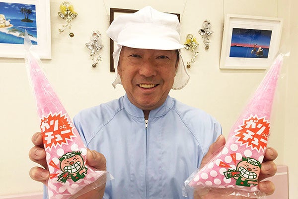 そして昭和44年(1969年) 、形を三角形にしてより食べやすさを追求、キャラクターもデザインされた「ガリっとチュー」が誕生。命名は私です。ピーク時は1日10,000個以上を造っておりました。