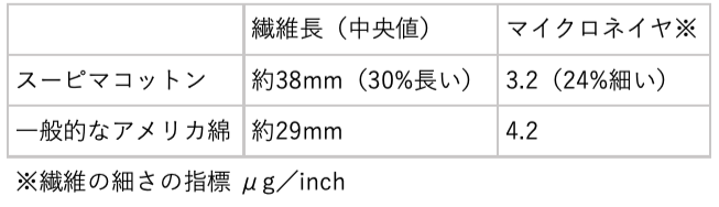 コットンの品質をはかる2つの指標が繊維長とマイクロネイヤです。繊維長とはズバリそのコットンを構成する繊維の長さで、長いほど品質が高くなります。マイクロネイヤは繊維の太さ(細さ)の指標で、数字が小さいほど繊維が細くしなやかであると評価されます。下図はスーピマコットンと一般的なコットンの比較図です。