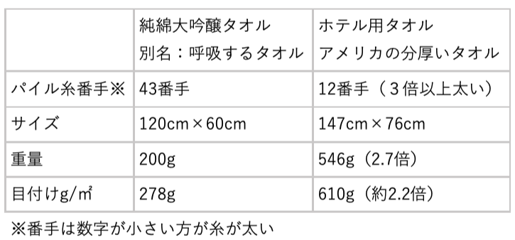 下図は純綿大吟醸バスタオルとアメリカンサイズのバスタオルとの比較図です。