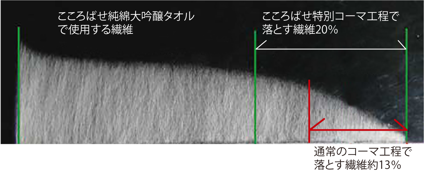 さらに、このスーピマコットン繊維の短い部分を取り除くコーマ工程を通すことで、短い繊維を20%強も櫛削って除去しています。通常のコーマ工程では13%前後の繊維を落としますが、こころばせのスーピマコットンは短い繊維を梳ってくしけずって、実に7ポイントも多く繊維を梳りました。パーセンテージでは通常より5割強多く短い繊維を梳っています!。まさに極限まで米粒を削る大吟醸酒さながら。大吟醸酒で米を削るようにコットン繊維の上質な長い繊維だけを残して糸にしているのです。