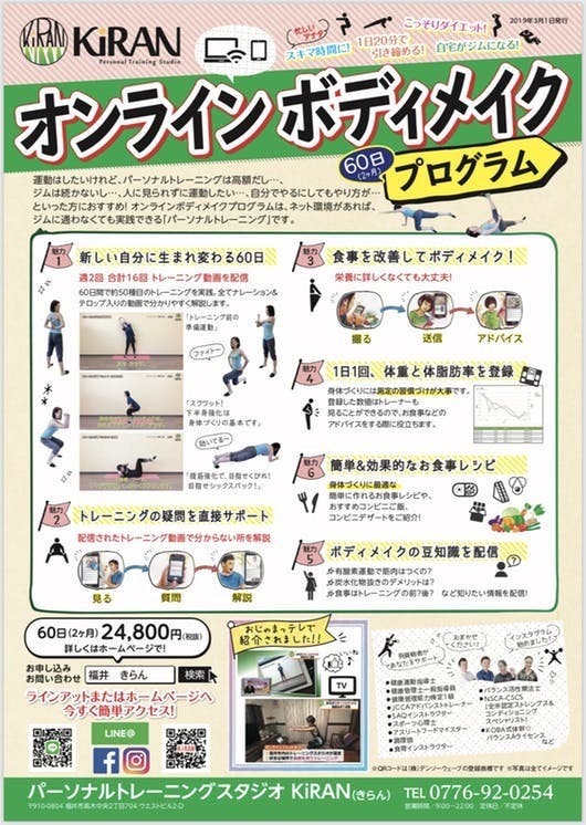 高校卒業後、スポーツ・運動を深く学び、将来仕事にしたいと考え、体育大学に進学。卒業後も、フィットネスジムや美容関連会社のボディメイク事業部などで、運動や栄養、健康といった、ボディメイクに関わる仕事を続けながら勉強を重ね、2016年4月、地元である福井県福井市にパーソナルトレーニングスタジオKiRAN(きらん)をオープンしました。
