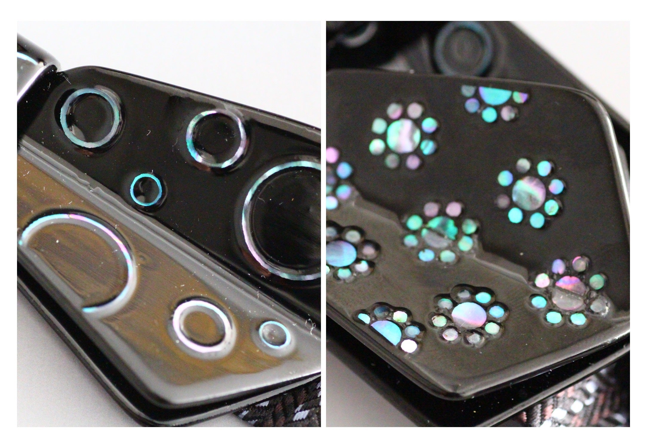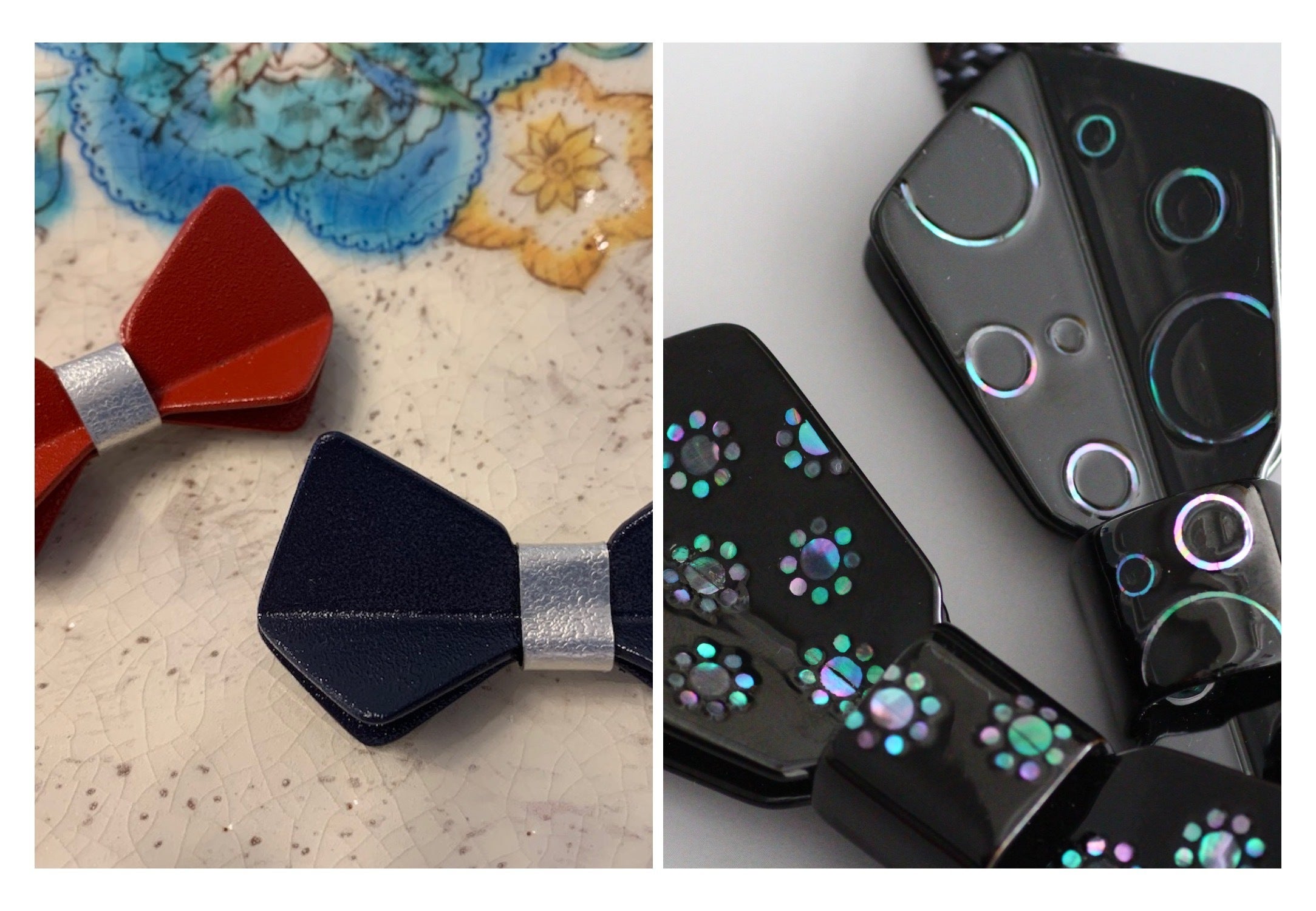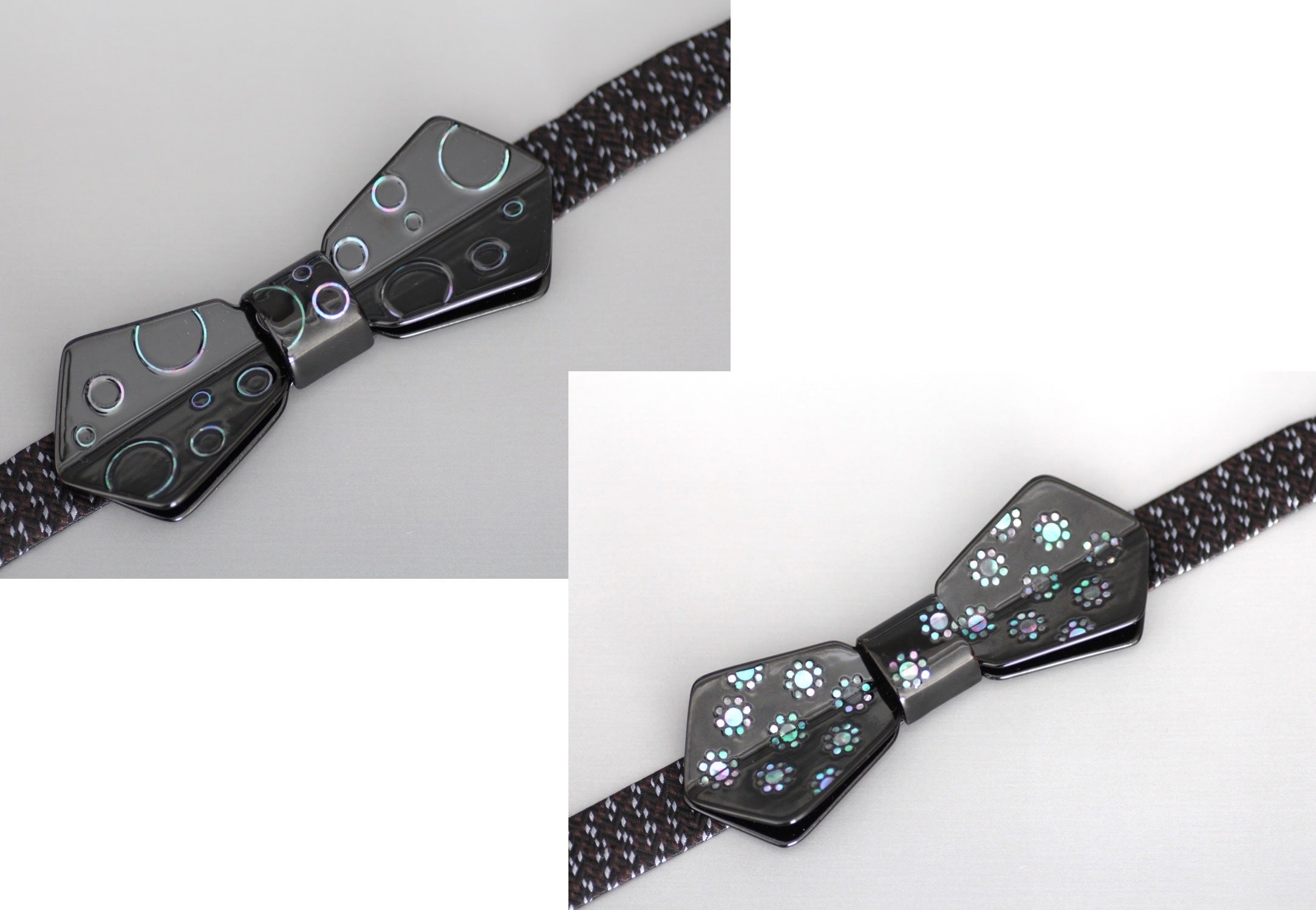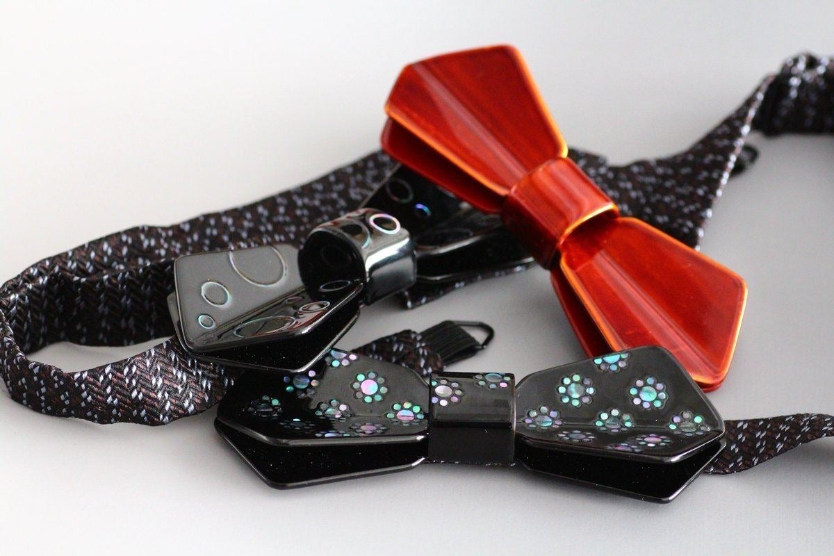 蝶ネクタイの模様は水玉模様と九曜紋の2種類があります。水玉模様は螺鈿の輪で水玉を表現しました。九曜紋はイタリアの指揮者・ピアニストであるセルジオバイエッタの動画にインスピレーションを得て作ったものです。