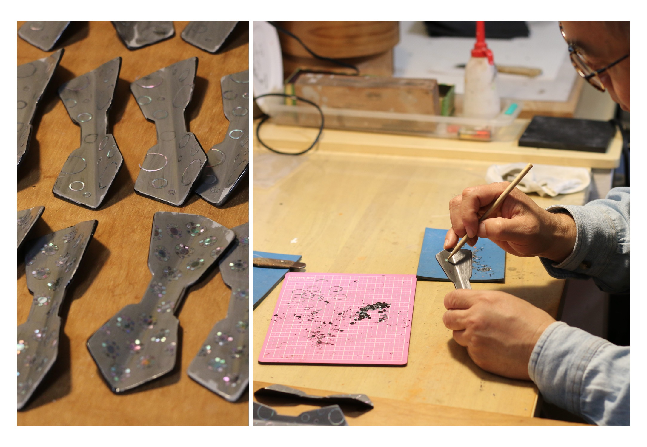 螺鈿は貝を手でカットして貼ります。とても細かく繊細な作業です。