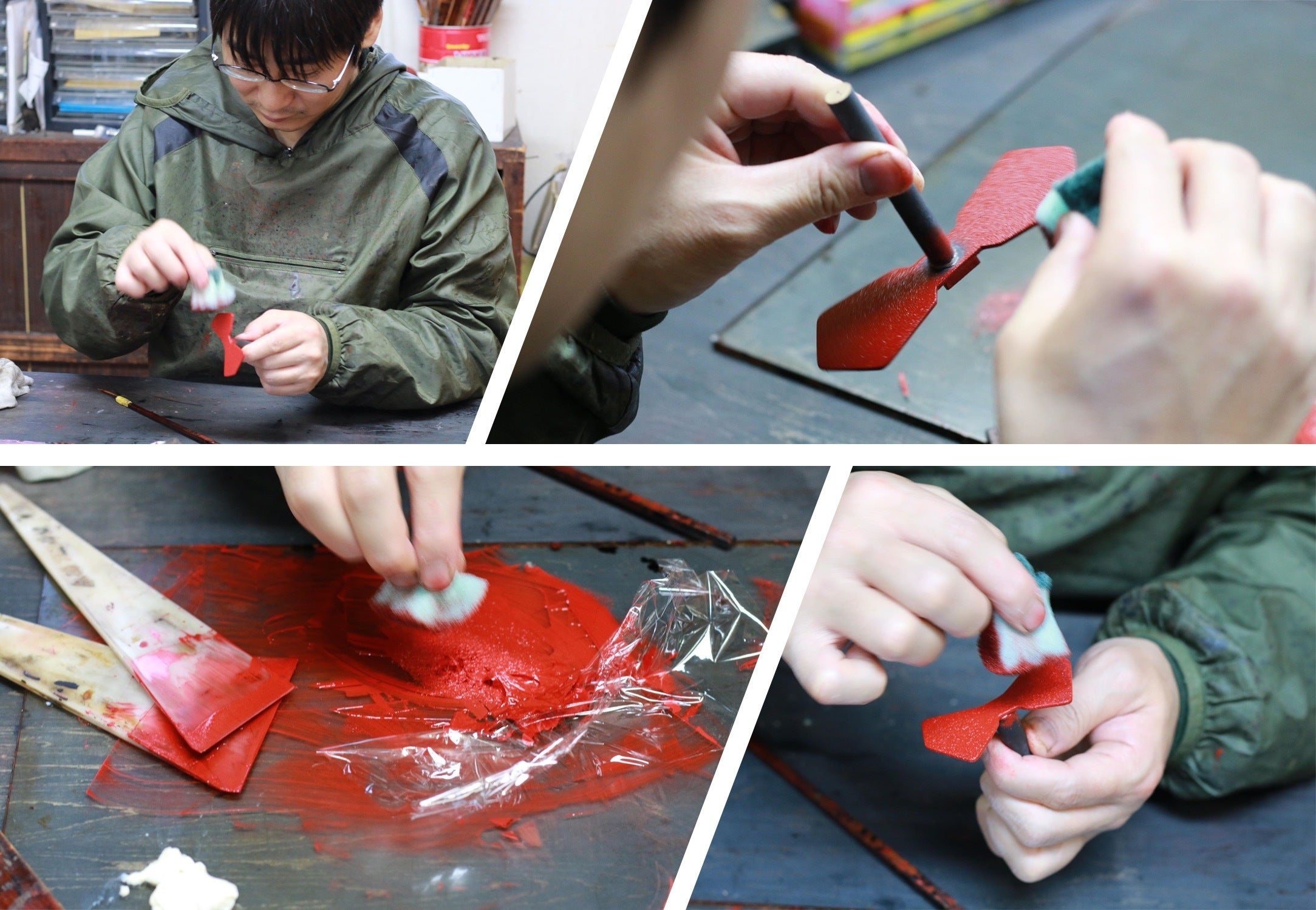 木地を漆で丁寧に何度も塗ります。その度ごとに乾かすので、手間と時間がとてもかかります。高岡の京田充弘さんに塗っていただいております。塗って乾かした後に丁寧に漆の表面を研ぎます。