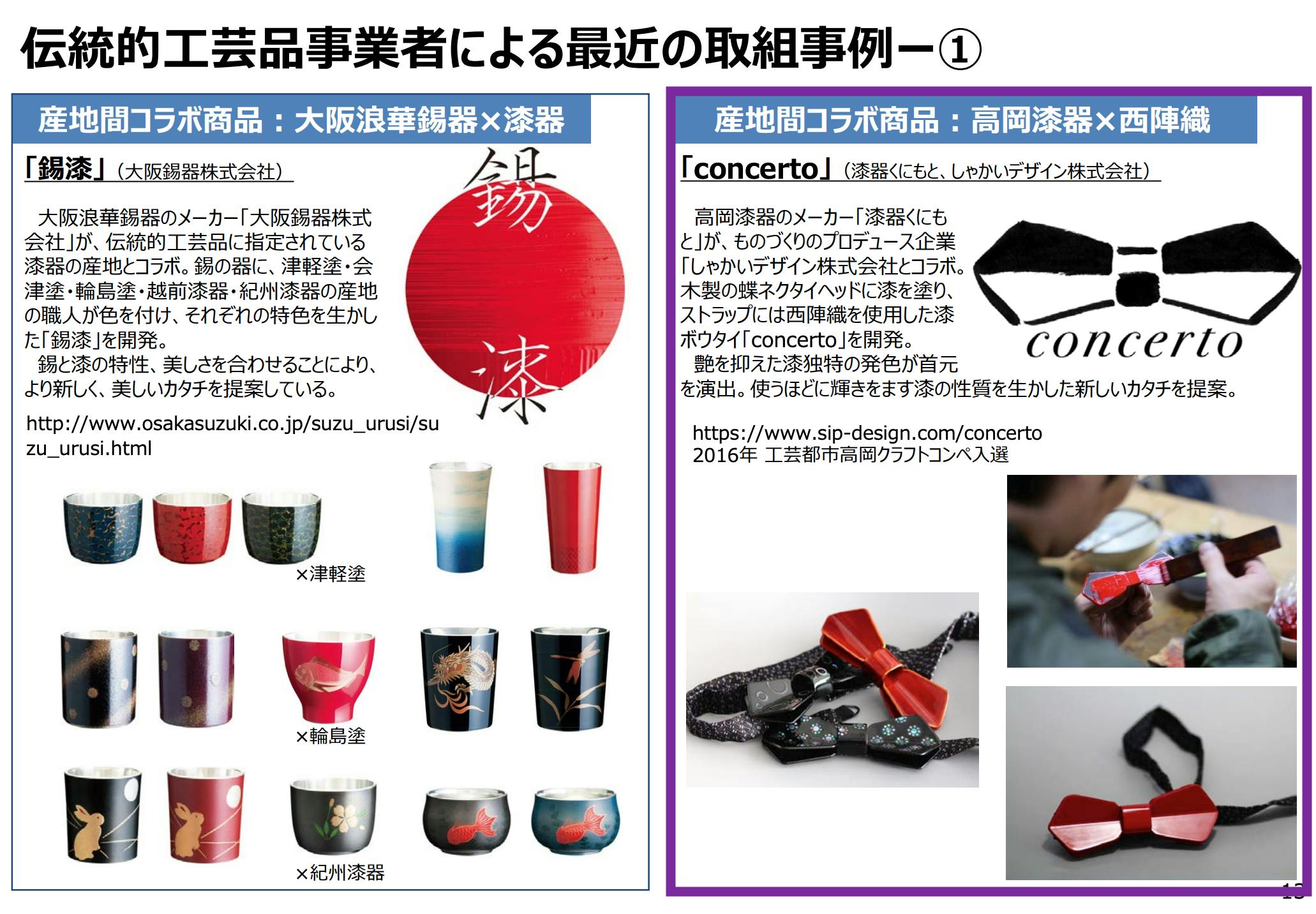 経済産業省の「伝統的工芸品産業をめぐる 最近の動向について」という報告書の中で、伝統的工芸品事業者による最近の取組事例として取り上げていただきました。蝶ネクタイCONCERTOは高岡漆器と西陣織の2つの産地のコラボ商品となっています。