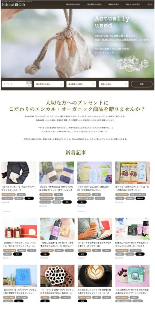 自分が好きなことと、「環境への影響も考える消費」についてできることを模索する中で作ったのが、エシカルな(地球環境や社会に配慮する)商品を、実際に使ってプレゼントとして紹介するメディアサイト「エシカルギフト」です。