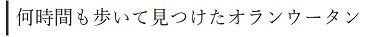 赤道直下のボルネオの森は、ものすごい湿気でした。ジャングルを歩いても歩いても、なかなかオランウータンを見つけることができず、長時間歩いてへとへとになったそのとき、目の前にふさふさした毛の大きな動物がジッとこちらを見ていました。手を震わせながら、急いで写真(下)を撮りました。やっと見つけた、初めて見る野生のオランウータンは、動物園で見たオランウータンよりも食べるものが少ないせいか、痩せ細って見えました。