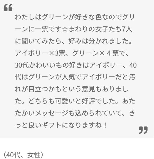 緑が欲しい人が多い傾向にある一方で、白が欲しいという人も一定数いるという結果でした。