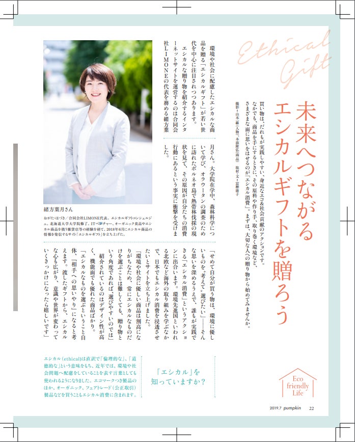 こんにちは!緒方葉月です。パトロンの皆様、温かい応援を本当にありがとうございます!現在の支援総額は606,840円!ついに303%も達成しております!本当にありがとうございます!残りあと【18日】です。引き続き、ご支援・応援のほどよろしくお願いいたします!先日、運営しているメディアサイトが大手の雑誌に掲載されました!女性向けのライフスタイルマガジ『pumpkin』さんに、特集でご紹介していただきました。今回はなんと、【3ページ】分もエシカルギフトについてご紹介いただきました。パンプキンさんは、誰もが知っている有名雑誌『クロワッサン』の次に、女性向けライフスタイルでは発行部数が多く、また『ミセス』や『婦人画廊』よりも発行部数が多い雑誌です。こんなに豪華に、しかも素敵な雰囲気でご紹介していただき、感謝の気持ちでいっぱいです。雑誌には全ての商品が掲載されているわけではないですが、今回の掲載を通して、エシカルでしかもオシャレで、プレゼントに贈りたくなる商品が世の中により知ってもらう機会になり、とても嬉しく思います。パンプキンさんは、厚みの割に内容がとても充実していて、読み応えのある雑誌です。今回の感謝の気持ちを忘れずに、今後も続けて行こうと思います。