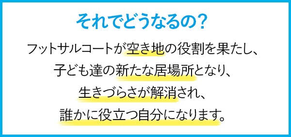 遊べる場所がない上に、塾や習い事で忙しい現代の子ども達にフットサルコートという、いつでも無料で利用できる「空き地」を用意したい。