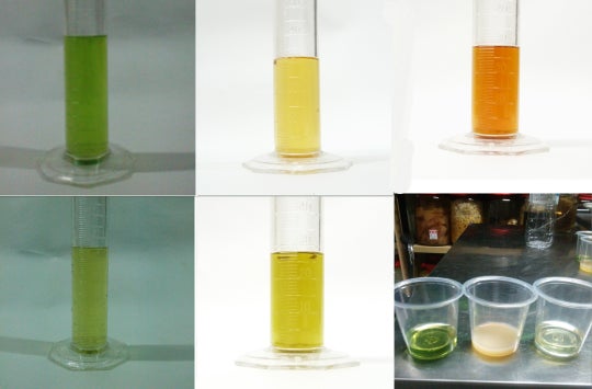 ヨモギのグリーンは非常にきれいに出ました。試飲カップの左がヨモギです。これはヨモギだけをスピリッツに漬け込んだものです。同時に漬け込んだのがアブサン0号です。