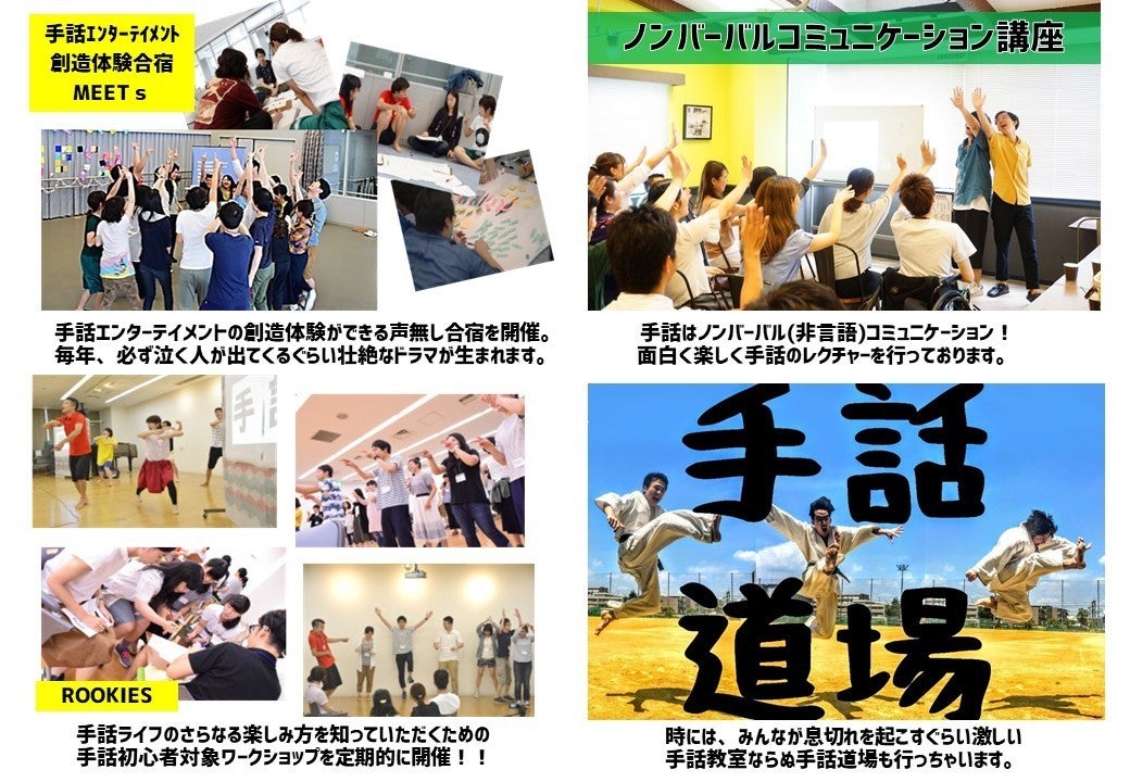 上記以外に「手話」および「手話エンターテイメント」のさらなる発展、普及を図るための取り組み(イベント事業の運営やコラボパフォーマンス活動)を行ったり、SNS(Facebook、Twitter、instagram、YOUTUBE等)を通した「手話」や「きこえない人の生活」に関する啓発活動等も行っております。
