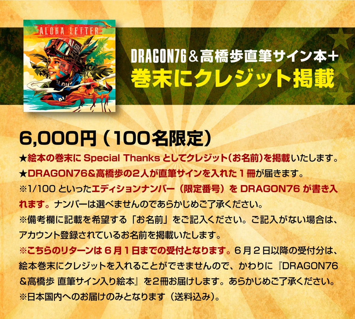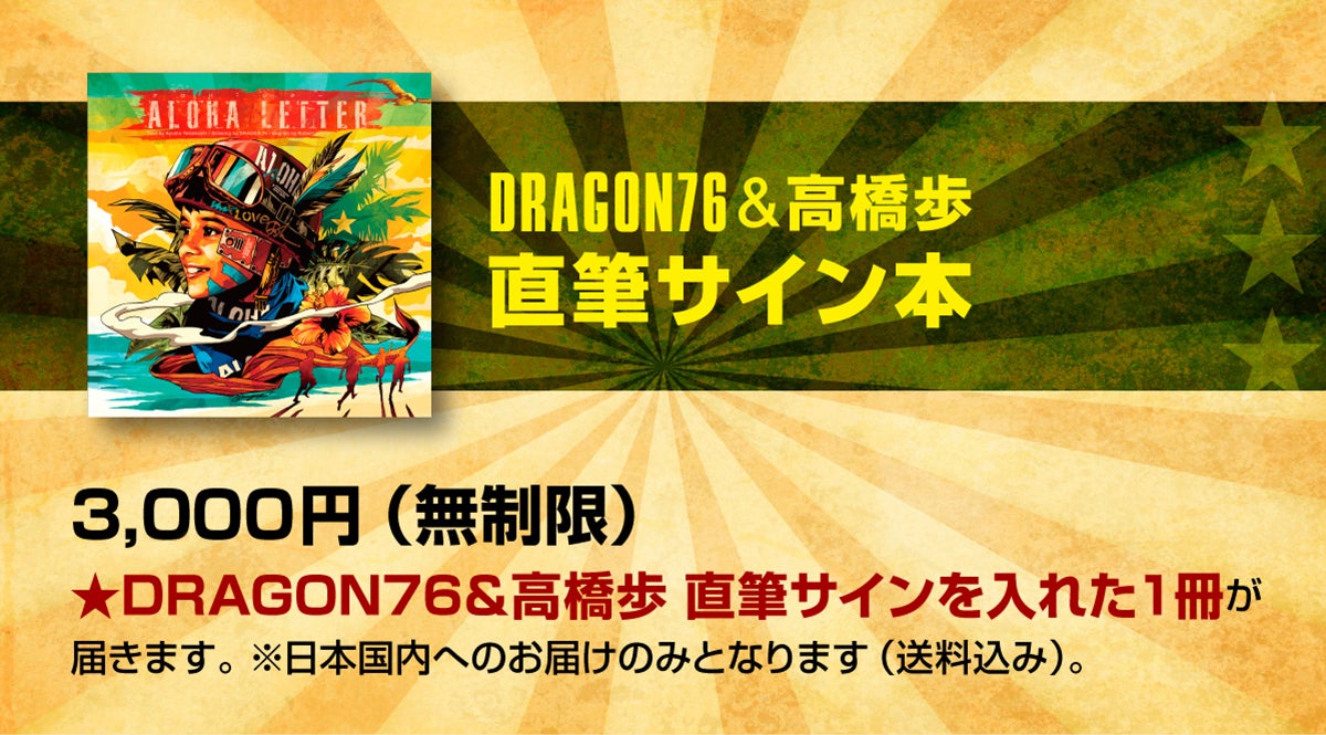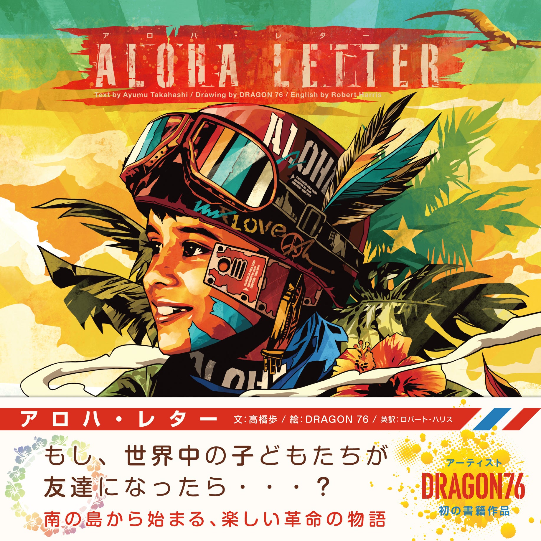 高橋歩×DRAGON76のコラボレーション絵本『ALOHA LETTRE』の発刊し、ひとりでも多くの人にこの作品を知ってもらい、想いを共有し、世界平和への一歩を踏み出し、そして実現させるために、皆様のご支援をいただきたいと思います。