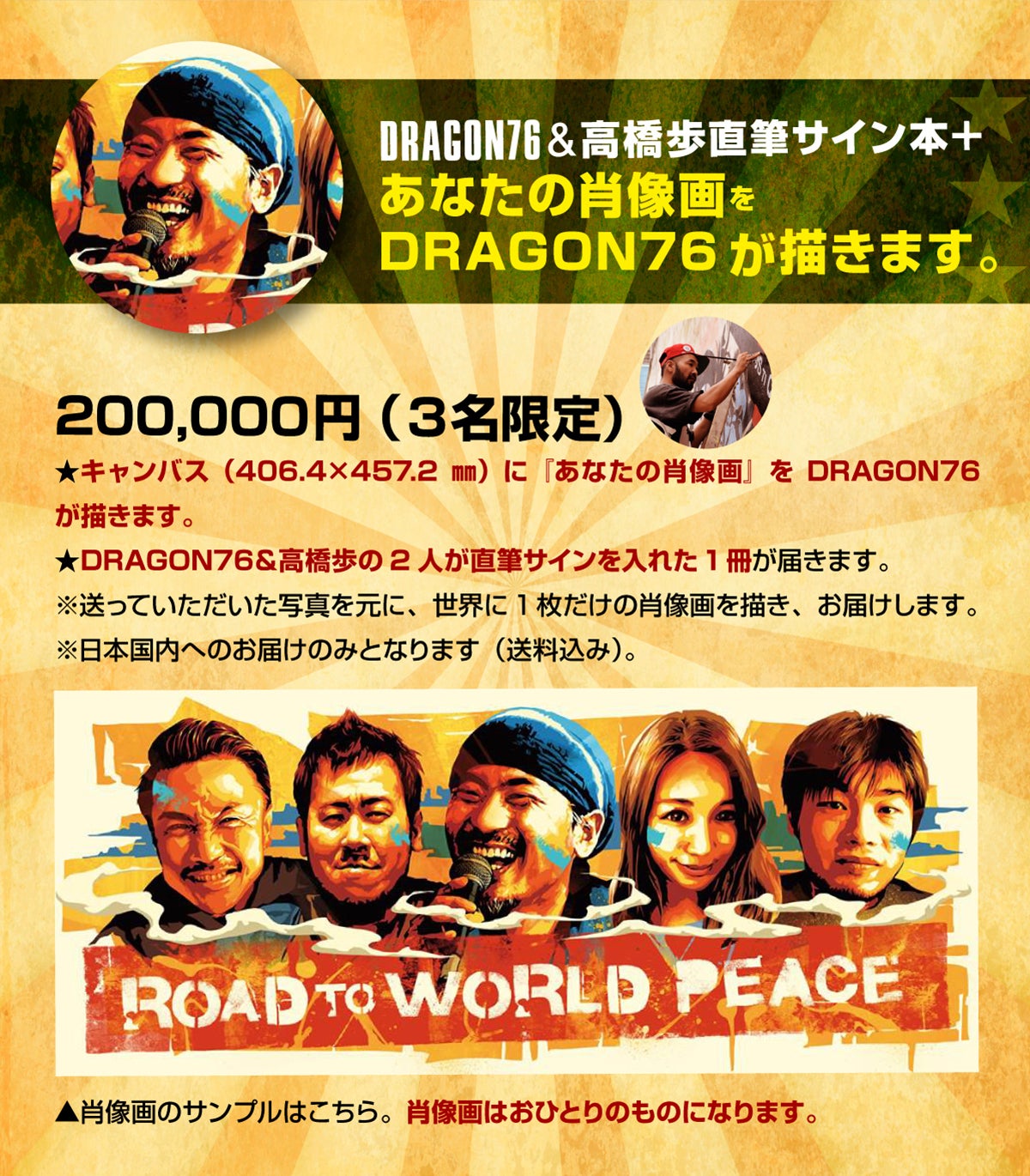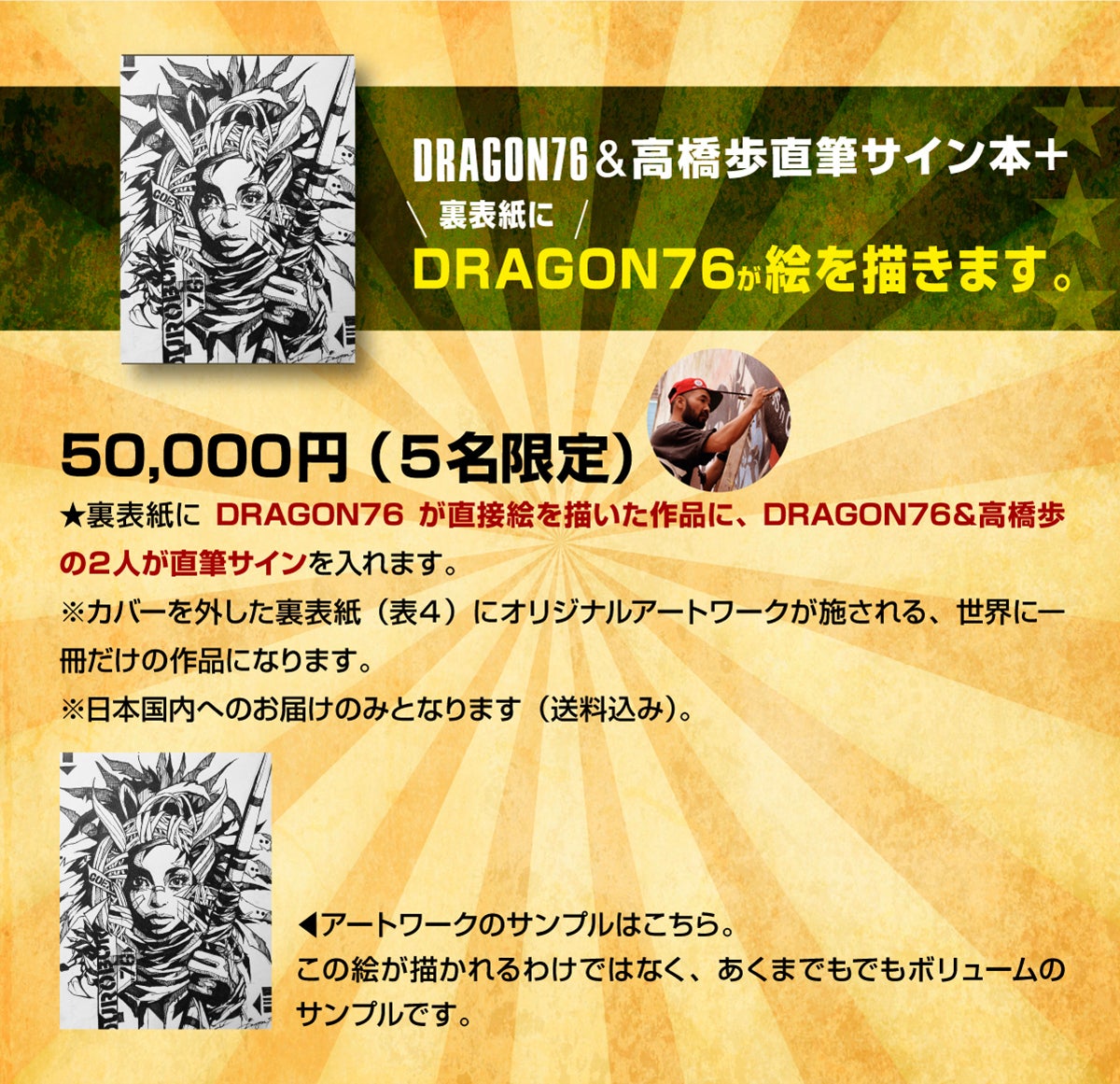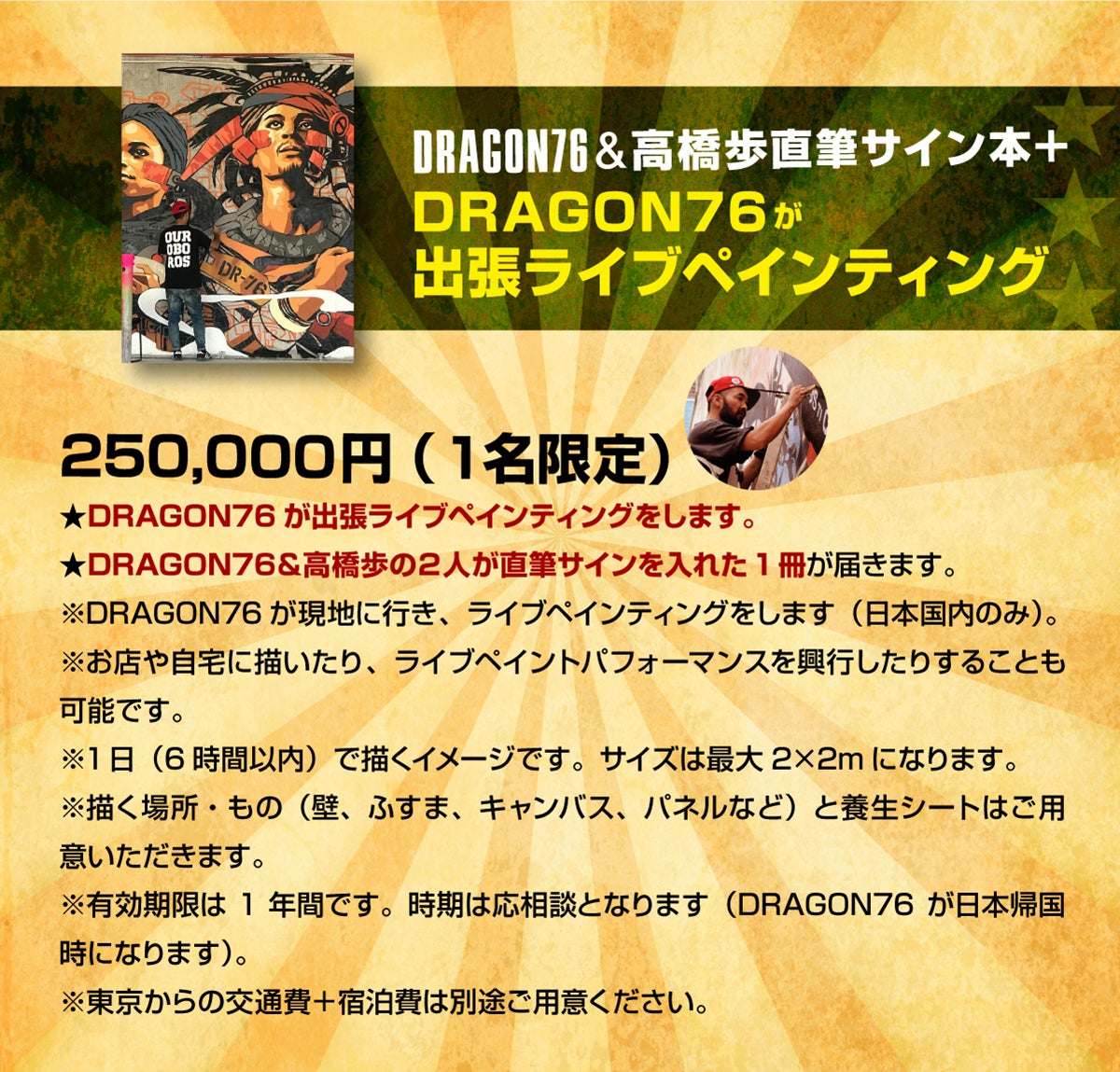 今、世界中で大ブレイクしているDRAGON76が、世界で1枚のあなたの肖像画を描いてくれたり、自分の家やお店やイベントにDRAGON76を呼んで、ライブペインティングをしてくれたりとか、出版記念限定で、かなり熱いリターンを用意しました。