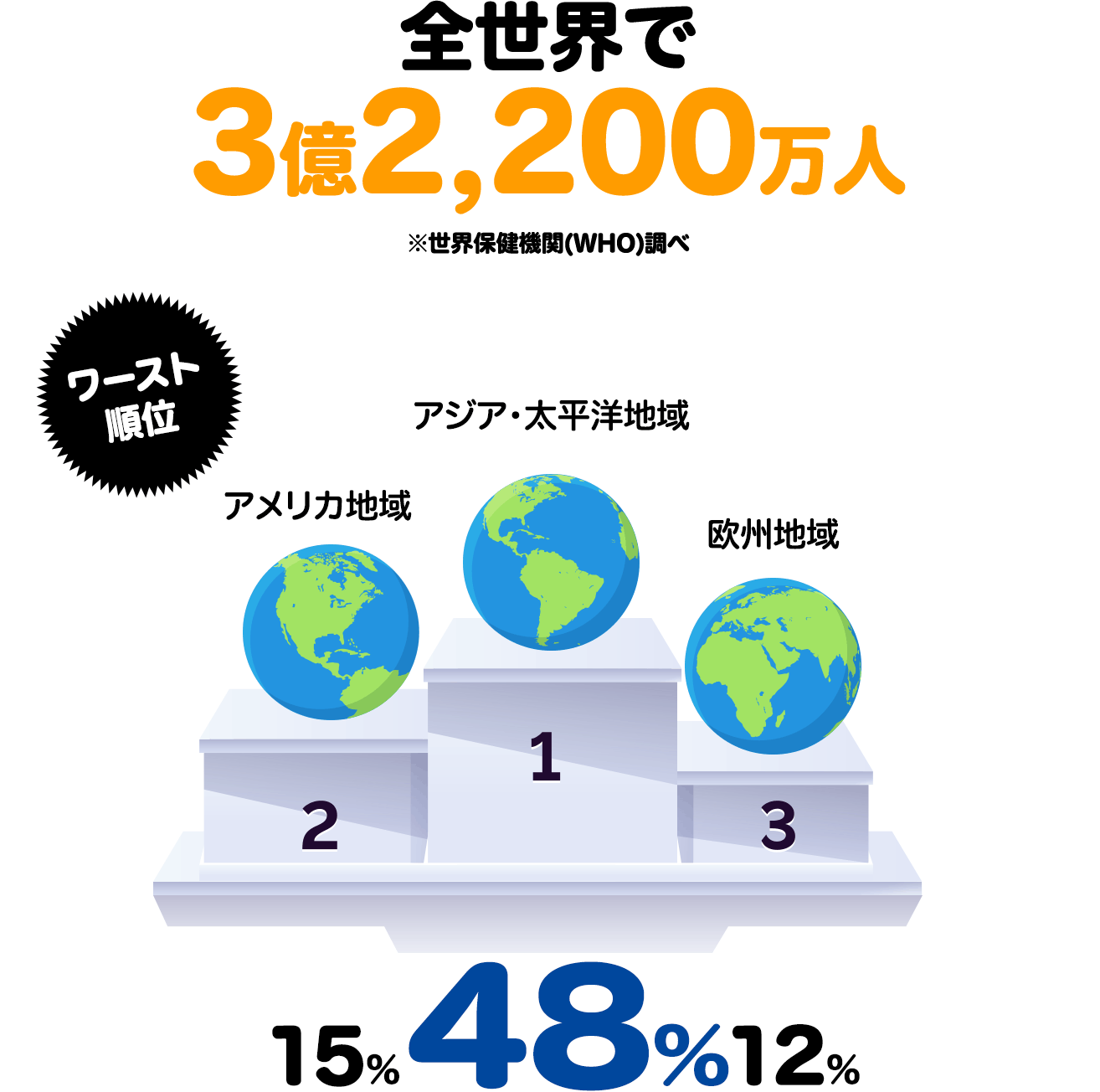 うつ病患者はアジア・太平洋地域は世界全体の約48%で、次いでアメリカ地域が約15%、欧州地域が約12%という厚生労働省のデータがあります。