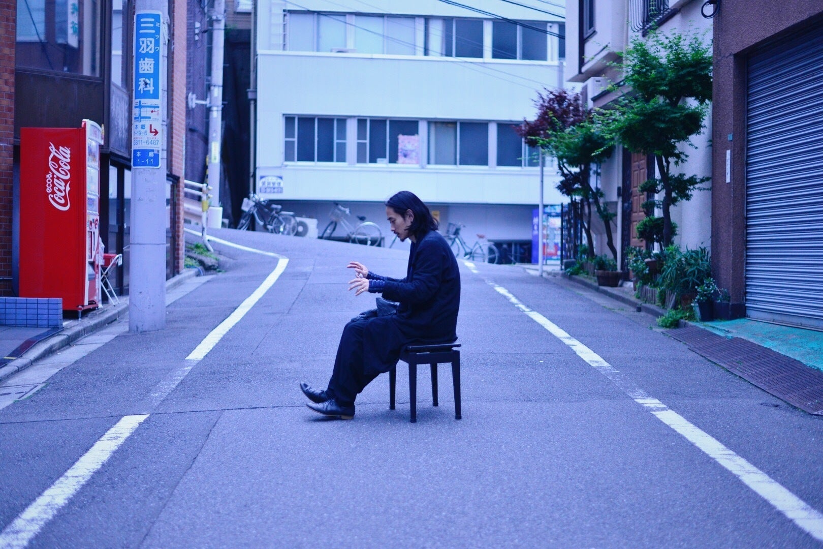 ピアノの椅子に座って、見えないピアノを弾くピアノマンを撮っています。