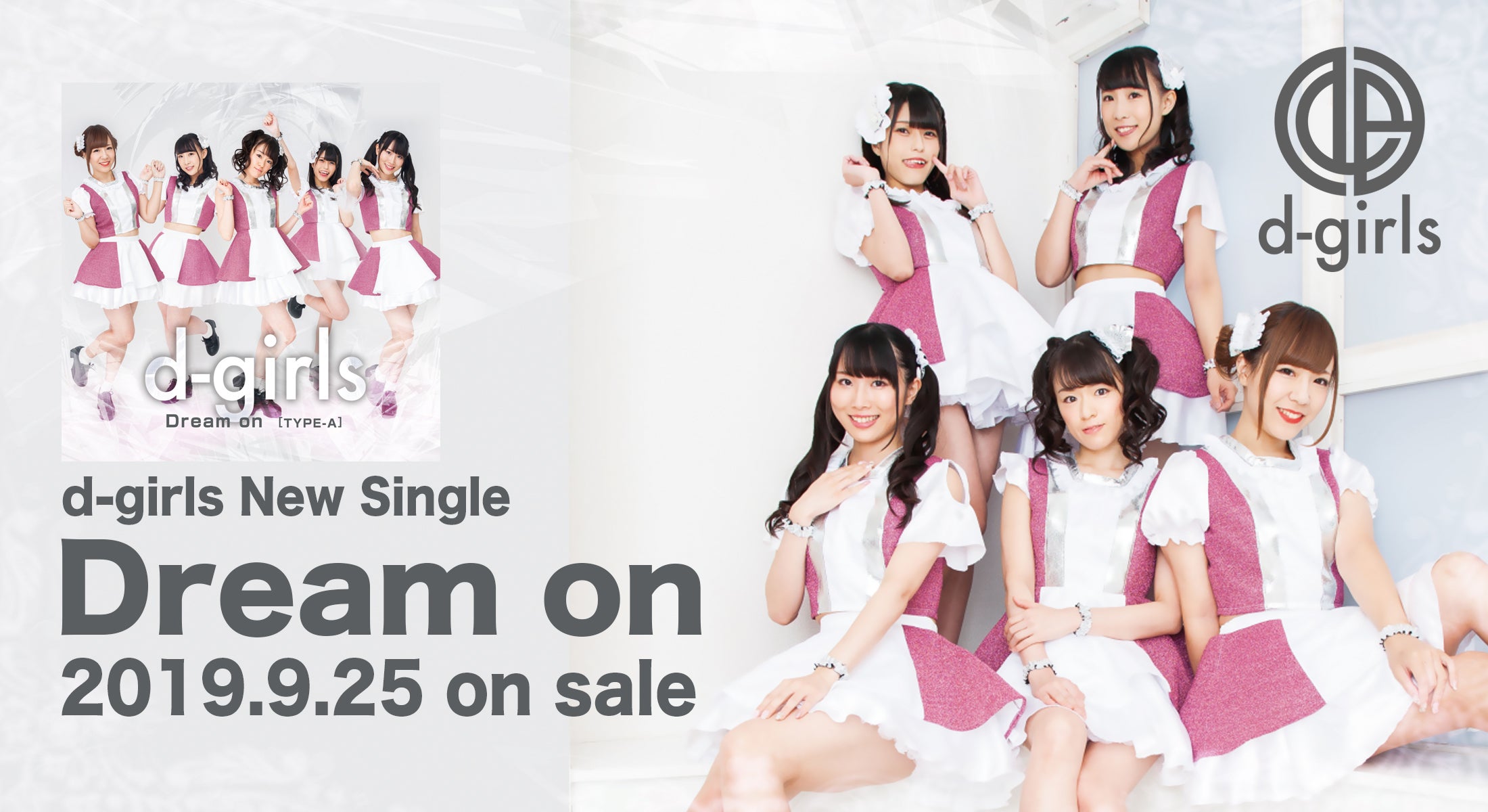 d-girls New Single 「Dream on」2019.9.25 on saleみなさまのご支援のおかげもありまして、d-girls New Single「Dream on」が2019.9.25に発売いたします。クラウドファンディングの時にお伝えしました通り、今回のシングルはカップリング違いの4形態での発売することになりました。是非、こちらもよろしくお願い致します。Dream on [TYPE-A]価格:1,000円+税品番:FDCD-00081. Dream on2. これまでのミチ、今、これからのミチ ~540.8km~ Acoustic ver.Dream on [TYPE-B]価格:1,000円+税品番:FDCD-00091. Dream on2. NEGAIDream on [TYPE-C]価格:1,000円+税品番:FDCD-00101. Dream on2. Super BirthdayDream on [TYPE-D]価格:1,000円+税品番:FDCD-00101. Dream on2. Call my name
