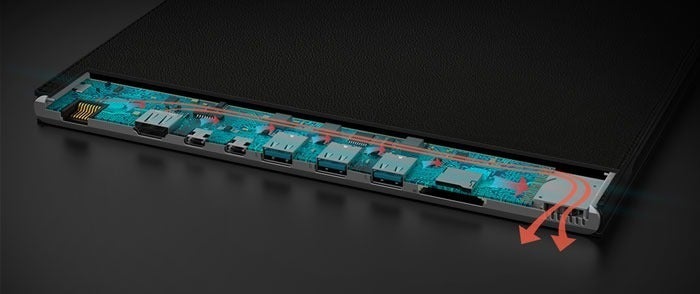 13インチモデル、15インチモデルの双方に10,000rpmの冷却ファンが埋め込まれています。そうすることで、他モデルと同じ条件下で作業した場合、ドッキング部分の温度を約8℃下げることが可能になります。