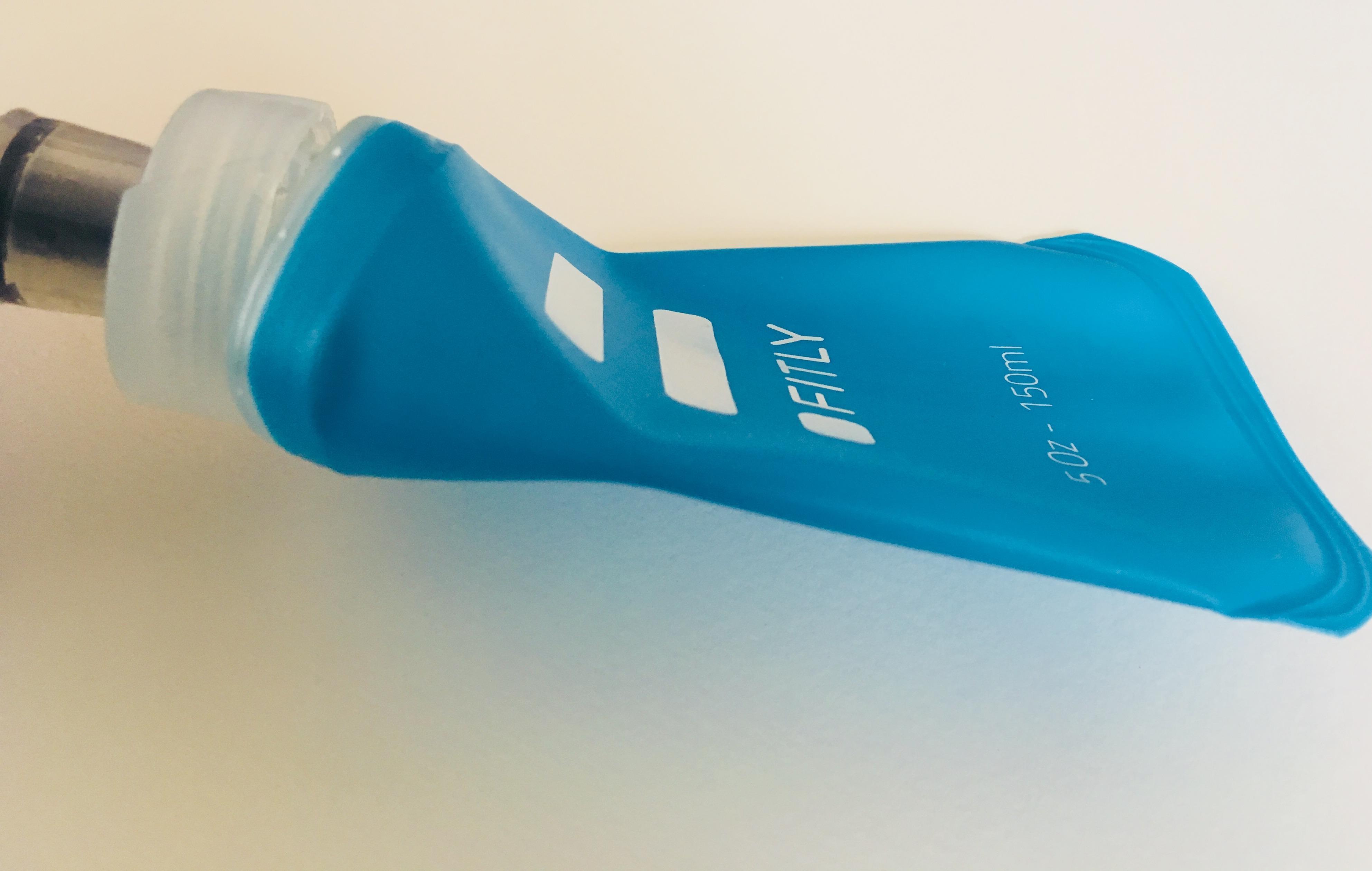 FITLY専用の150mlボトルです。飲み口が特殊なバルブ構造になっており、飲み口を軽く噛み、本体を握る事によって給水します。もちろん、噛まない限り水は漏れません。