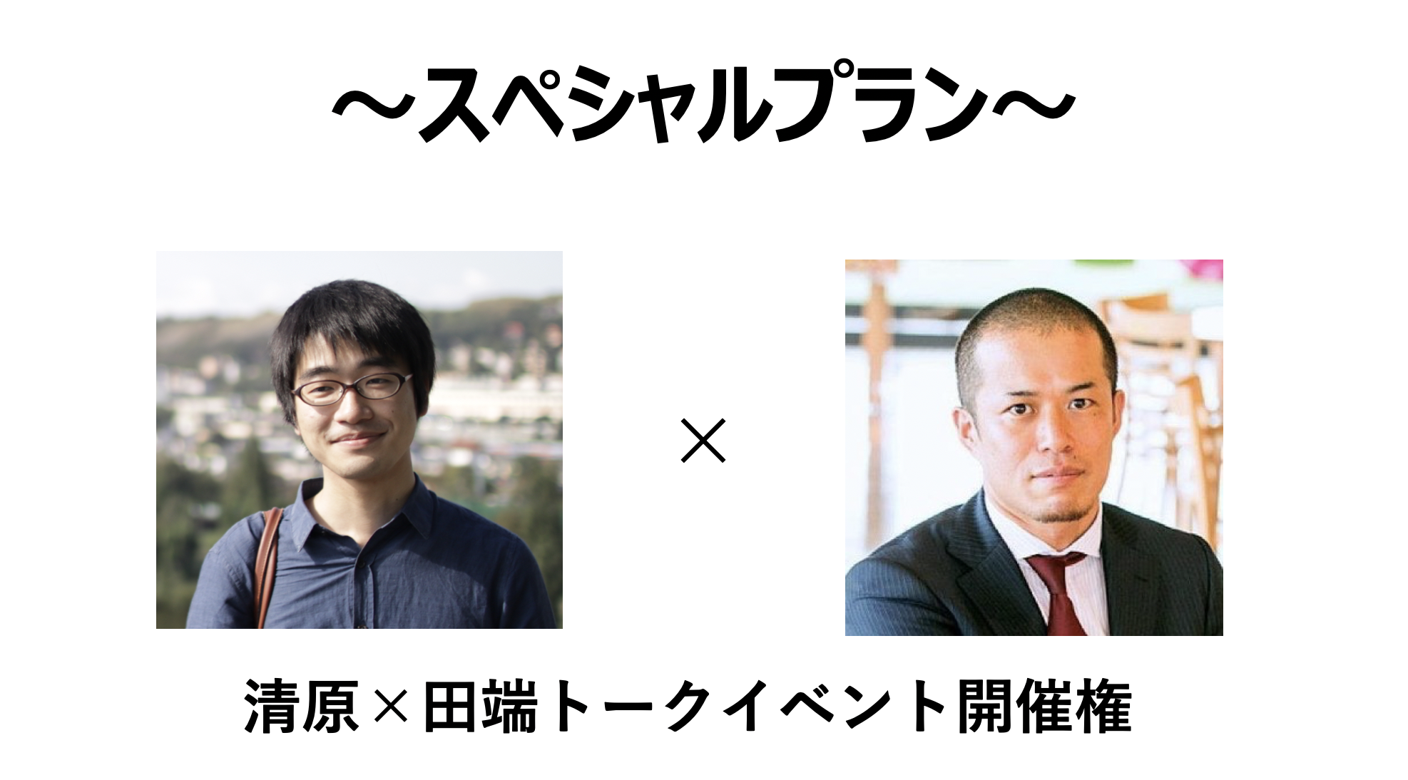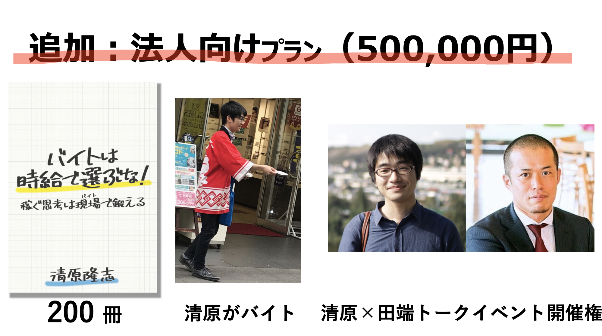 清原が貴社でアルバイトを体験し、感じたことをもとに田端氏とのトークイベントを開催できるプランです。清原のマクドナルド、GUで培った現場感と、田端氏のビジネス的観点、そして集客力を掛け合わせて、貴社の採用支援、就活支援、認知向上に貢献します。