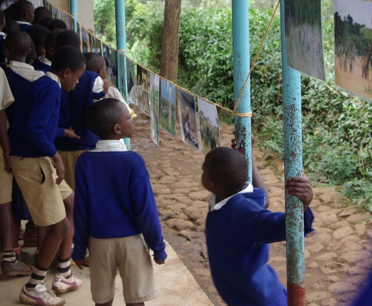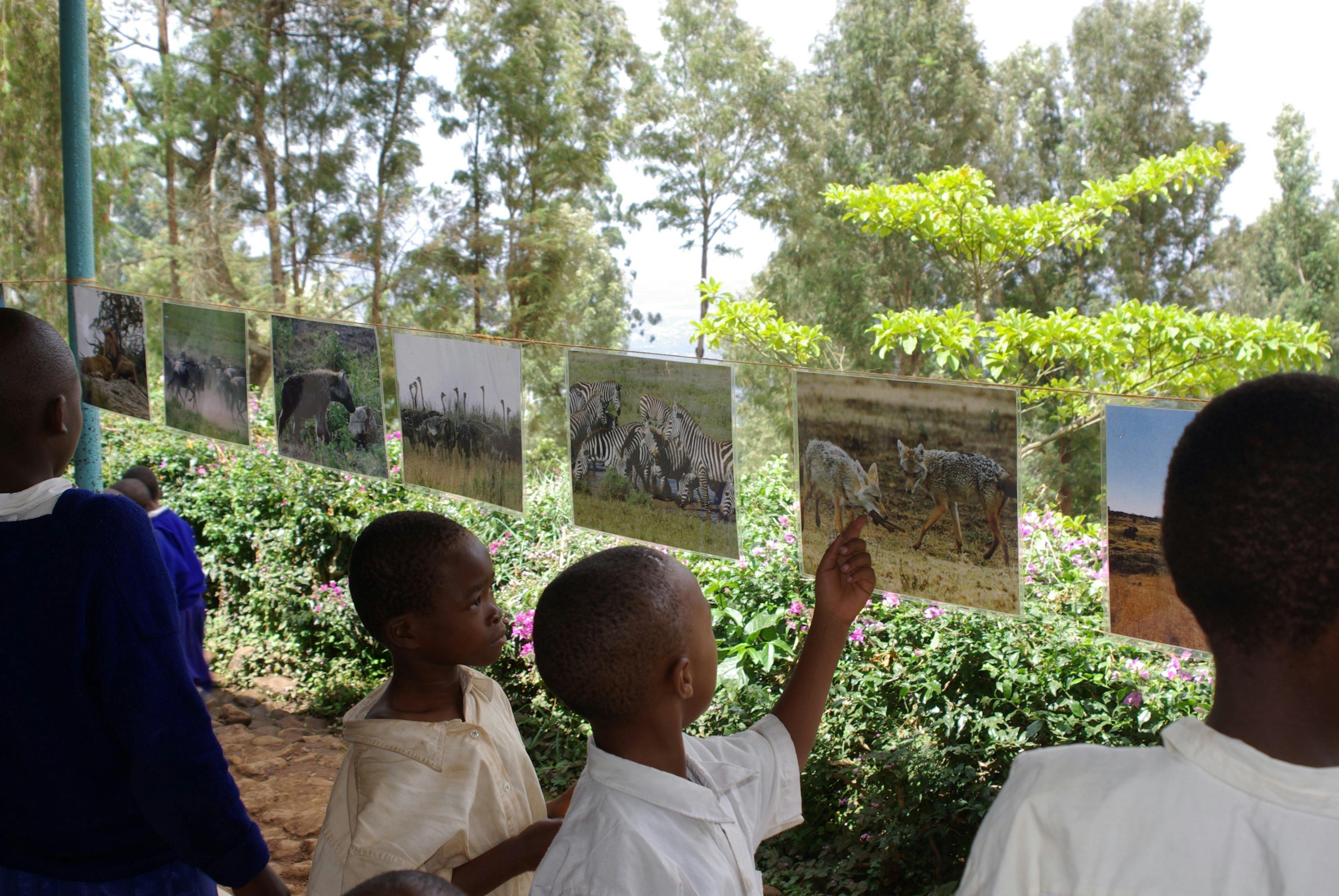 この写真は、子供たちが生まれて初めて、サファリで生きる野生動物たちを見ている姿を写したものです。以前、私がキリマンジャロの小学校で開催した、小さな個展です。