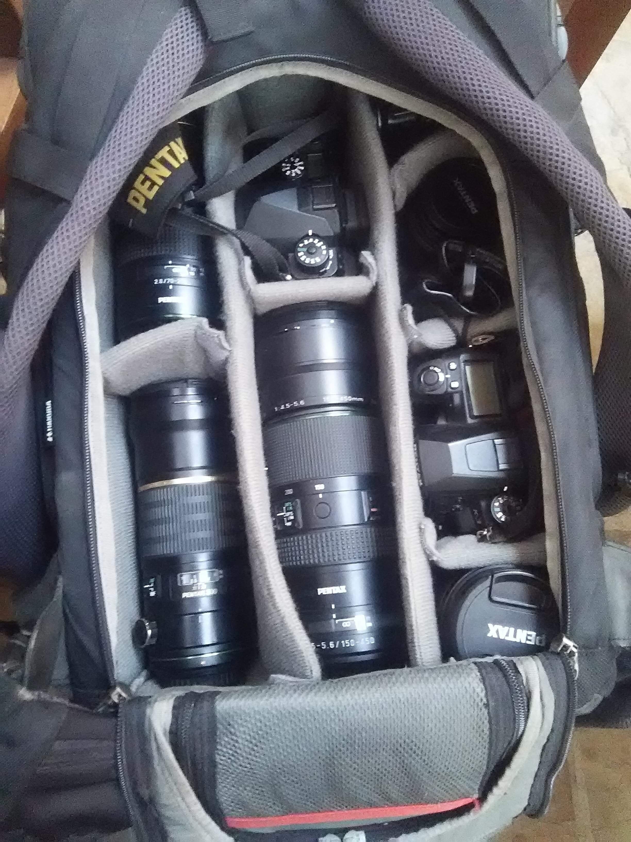 A.カメラボディ3~4台、レンズ望遠、広角、標準等、約7~8本