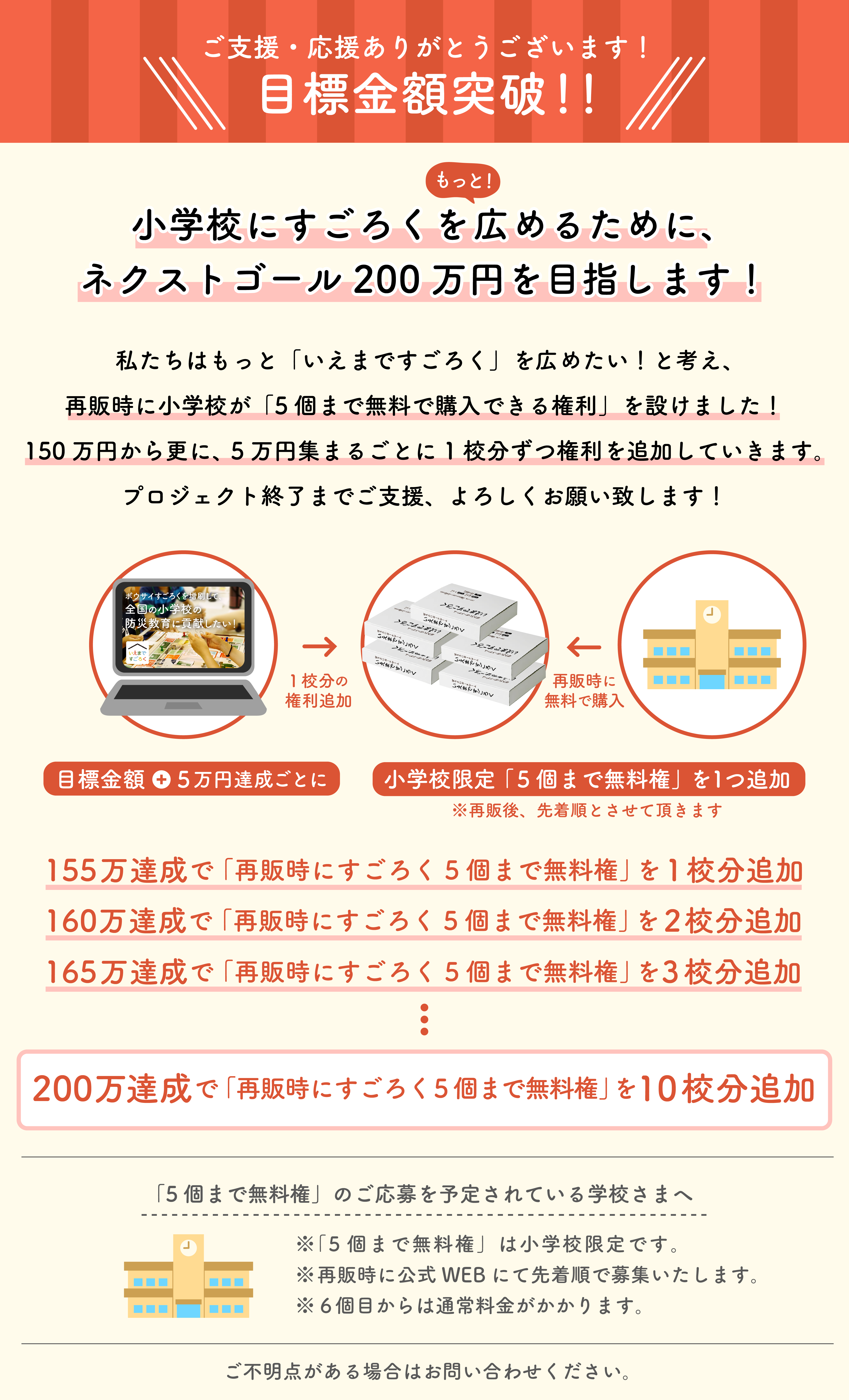 2019/07/22 18:30yamory スタッフの本多です。 みなさま、ご支援・応援ありがとうございます!本日、目標金額150万円を突破いたしました!!スタッフみんな「ほっ」としております。増版に向け、どんどん準備を進めていきますので、お手元に届くまでしばらくお待ちください。 さて、終了まであと少しですが、小学校にすごろくをもっと広めるために、ネクストゴール200万円を目指します。再販時に小学校が「5個まで無料で購入できる権利」を設けました!150万円から更に、5万円集まるごとに1校分ずつ権利を追加しています。例えば...・155万円達成で「すごろく5個まで無料権」を1校分追加・160万円達成で「すごろく5個まで無料権」を2校分追加 プロジェクト終了まで応援よろしくお願いします!! もっと見る