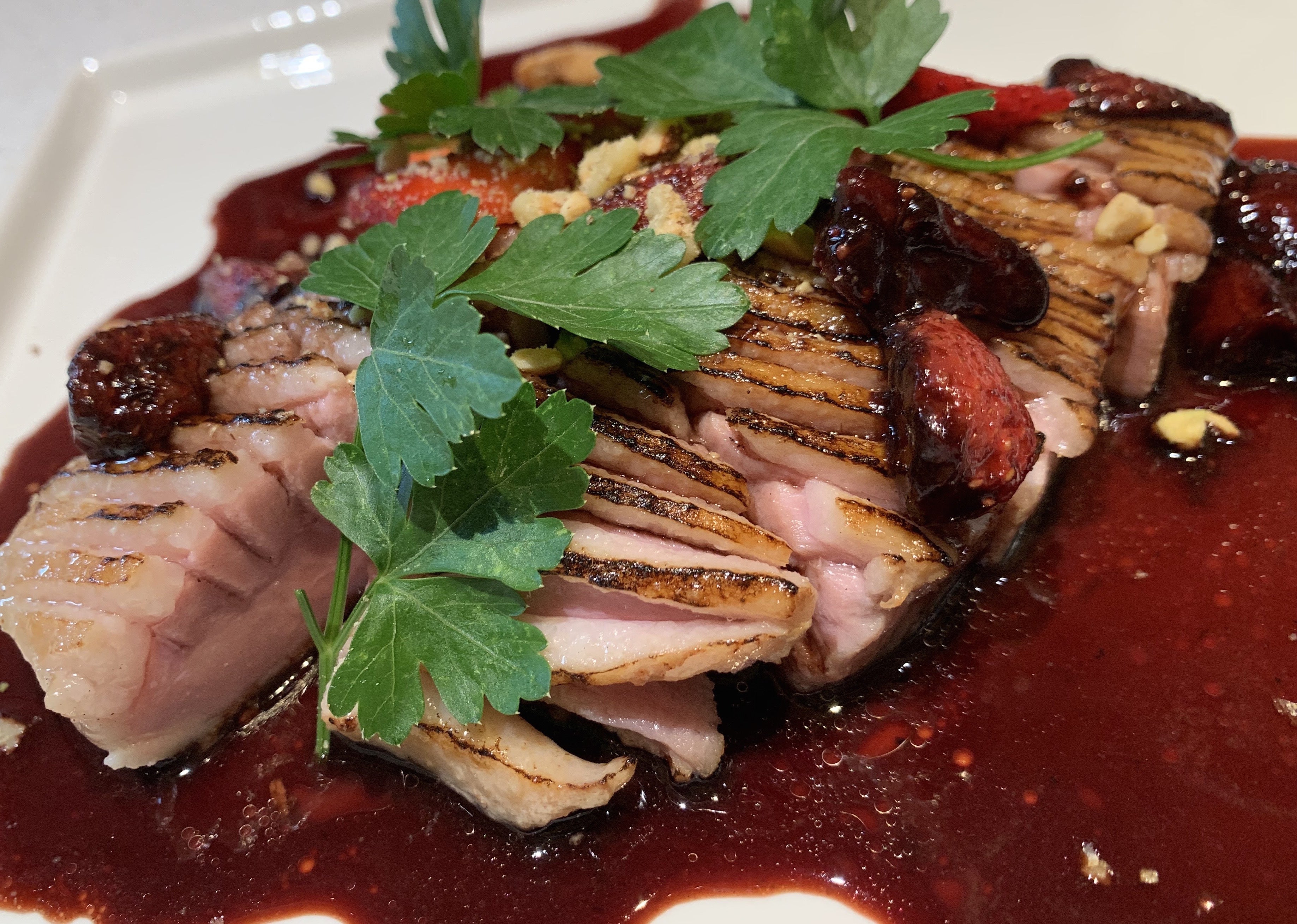 【やわらかジューシーな"合鴨肉の塊"季節のソースがけ】です。