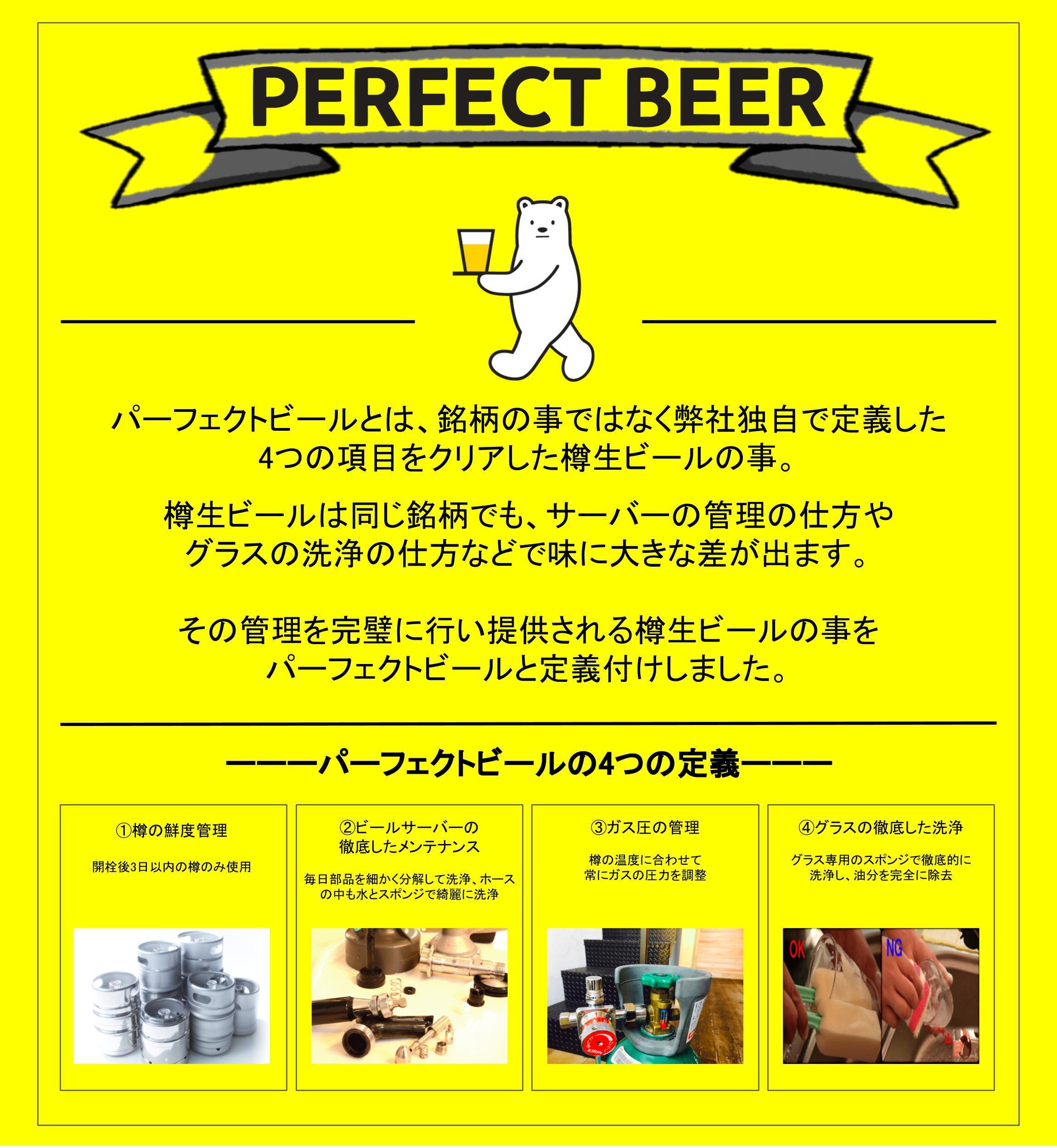 "パーフェクトビール"とわかりやすい名前で定義を作り、品質の差で味が変わる事を伝えています。