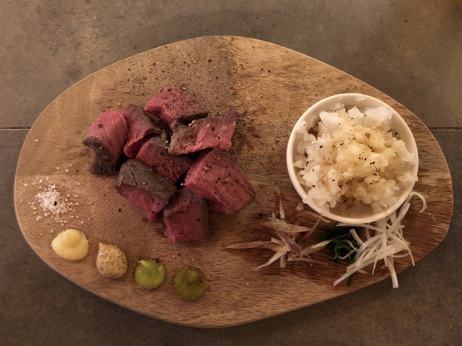 当店の圧倒的な看板メニューになるであろう商品は,合鴨肉を低温調理して角切りにカットして季節に合わせたソースで召し上がる。