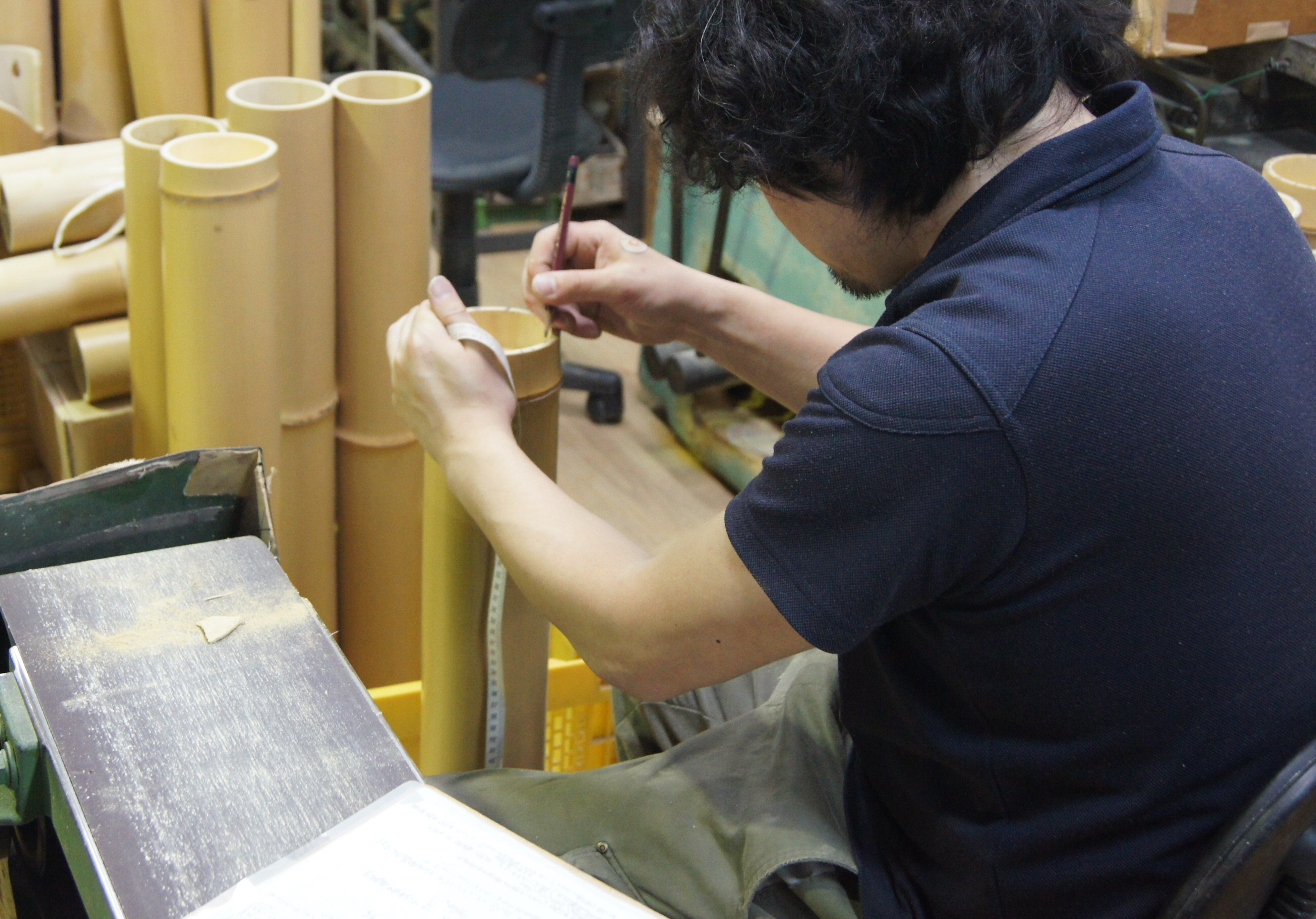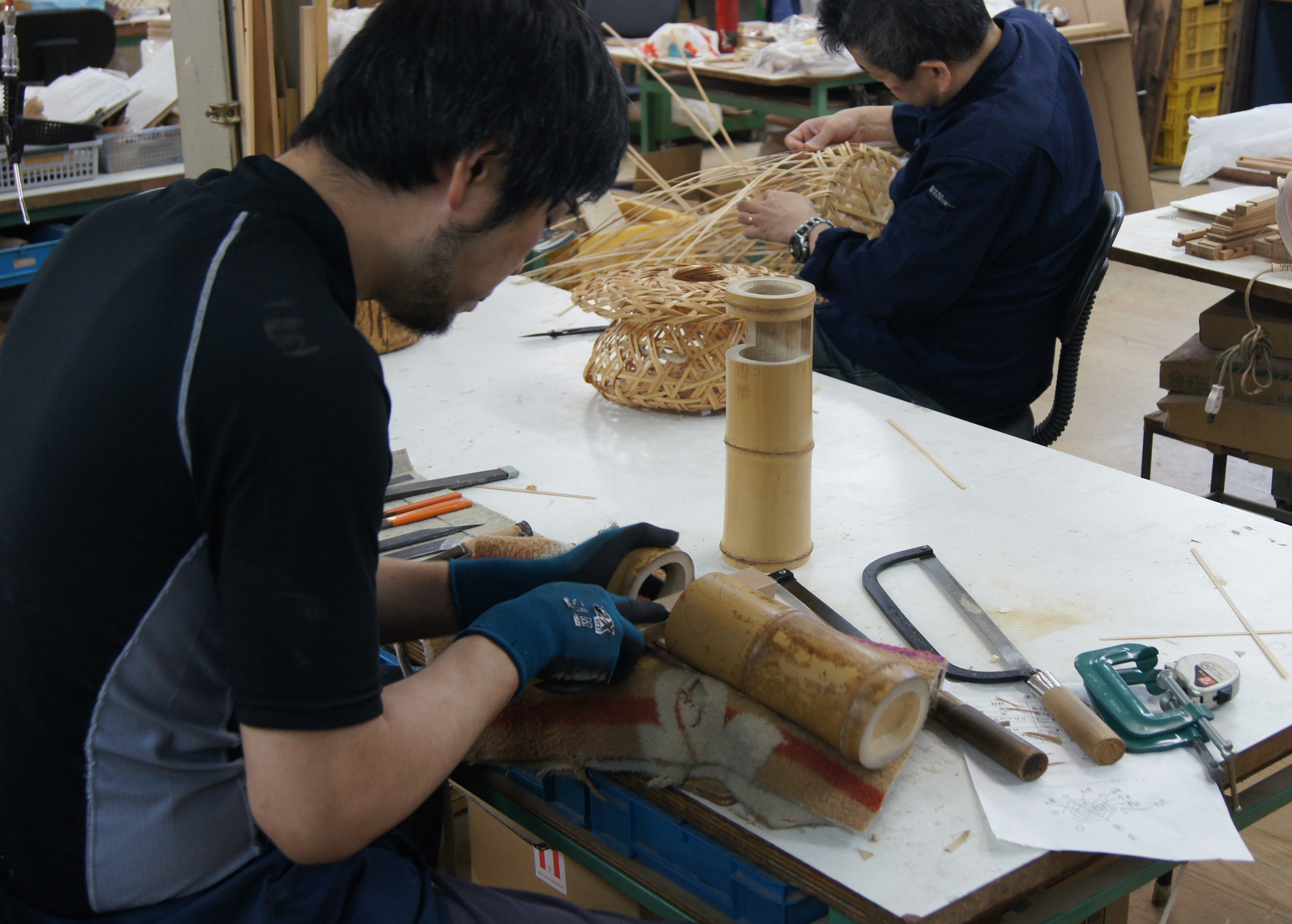 国内外から仕入れた、ひとつひとつ違う形の竹を職人さんの手で加工していきます。