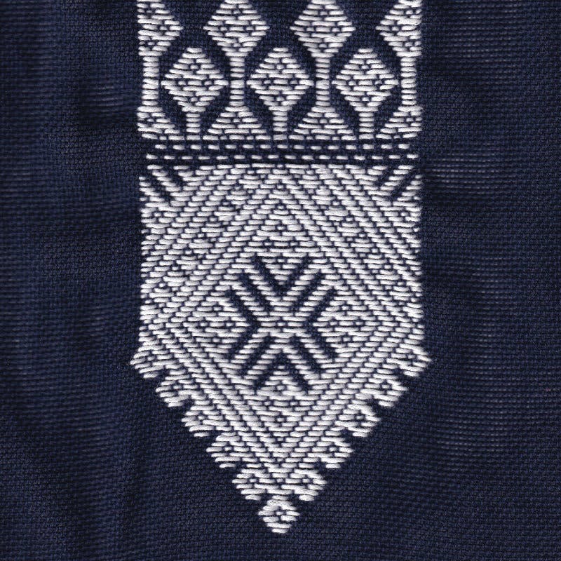 藍染の野良着(こぎん)に白い綿糸で刺繍を行ったものがルーツの、津軽地方に伝わる刺し子技法です。