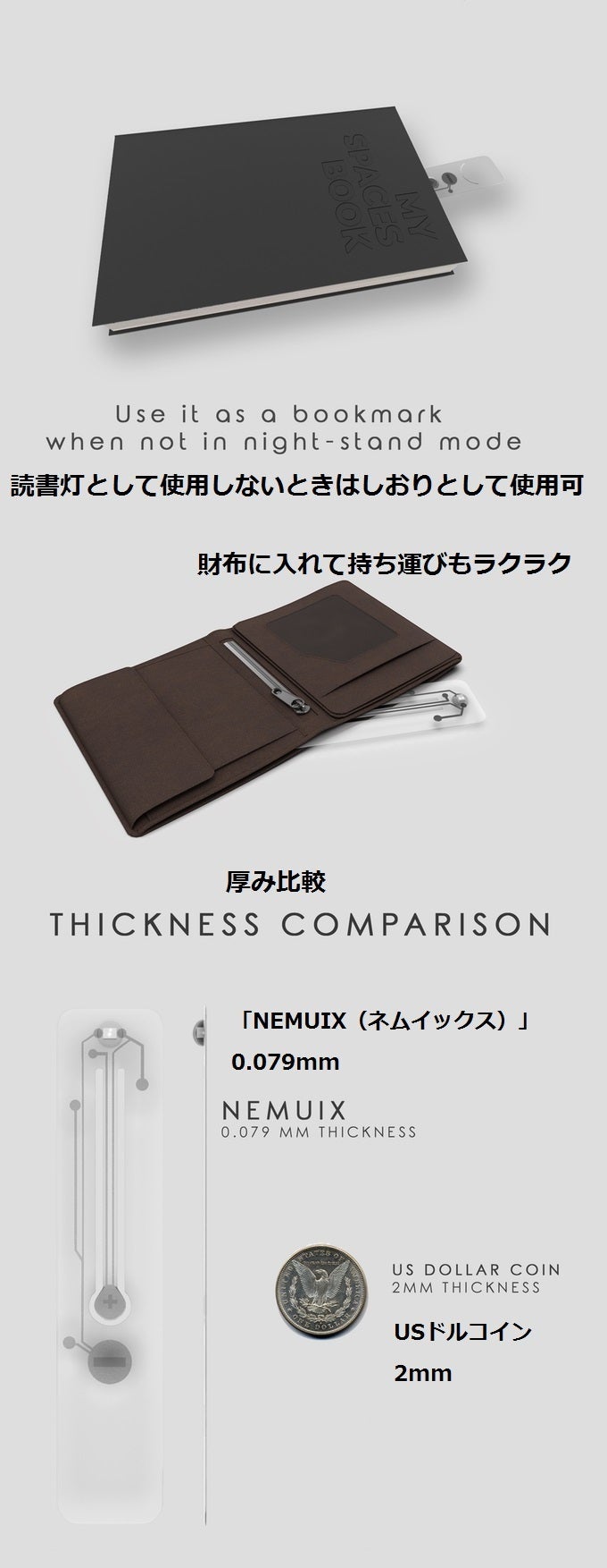 私たちは読書好きな全ての人がいつでもどこでも気軽に、そして目にダメージを与えるブルーライトの影響を受けずに、リラックスした状態で読書を楽しむための商品、「NEMUIX(ネムイックス)」を開発しました。読書灯兼しおりとしても利用できる「NEMUIX(ネムイックス)」は超軽量・薄型でシンプルなデザインから日常の様々なシーンで大活躍です。