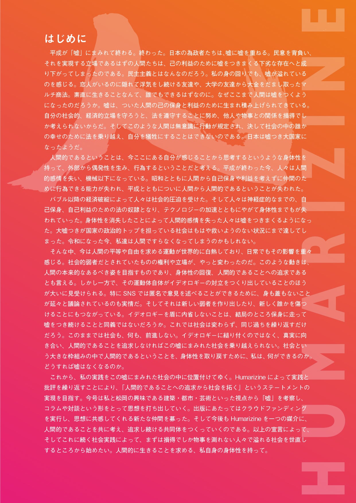 No.00「嘘」では、社会学や哲学を勉強している友人の村松摩柊を批評者に、私たちの実践そしてヒューマライジンを社会の中に位置づけてもらいます。ヒューマライジンを通して、実践(者)と批評(者)、そして社会や人間がゆるくつながり、議論が蓄積していくでしょう。このような雑誌であって共同体となるような「ヒューマライジン」をつくっていきます。